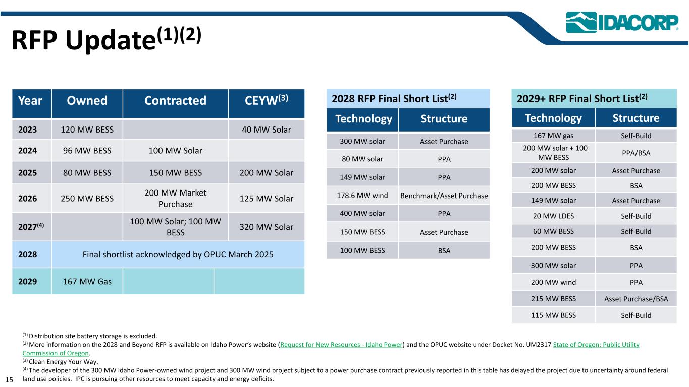 RFP更新(1)(2)年份自有合同CEYW(3)2023120 MW BESS 40 MW Solar 202496 MW BESS 100 MW Solar 202580 MW BESS 150 MW BESS 200 MW Solar 2026250 MW BESS 200 MW Market Purchase 125 MW Solar 2027(4)100 MW Solar;100 MW BESS 320 MW Solar 2028最终入围名单由OPUC确认2025年3月2029 167 MW Gas(1)Distribution Site电池存储不包括在内。(2)有关2028年及以后RFP的更多信息,请访问Idaho Power的网站(请求新资源-Idaho Power)和OPUC网站上的案卷编号。UM2317俄勒冈州:俄勒冈州公共事业委员会。(3)清洁能源你的方式。(4)受本表先前报告的购电合同约束的300兆瓦爱达荷电力拥有的风力项目和300兆瓦风力项目的开发商由于联邦土地使用政策的不确定性而推迟了该项目。IPC正在寻求其他资源来满足产能和能源不足的问题。技术Structure 167兆瓦燃气自建200兆瓦太阳能+ 100兆瓦BESS PPA/BSA 200兆瓦太阳能资产购买200兆瓦BESS BSA 149兆瓦太阳能资产购买20兆瓦LDES自建60兆瓦BESS自建200兆瓦BESS BSA 300兆瓦太阳能PPA 200兆瓦风电PPA 215兆瓦BESS资产购买/BSA 115兆瓦BESS自建152029 + RFP最终短名单(2)技术Structure 300兆瓦太阳能资产购买80兆瓦太阳能PPA 149兆瓦太阳能PPA 178.6兆瓦风能基准/资产购买400兆瓦太阳能PPA 150兆瓦BESS资产购买100兆瓦BESS BSA 2028 RFP最终入围名单(2)