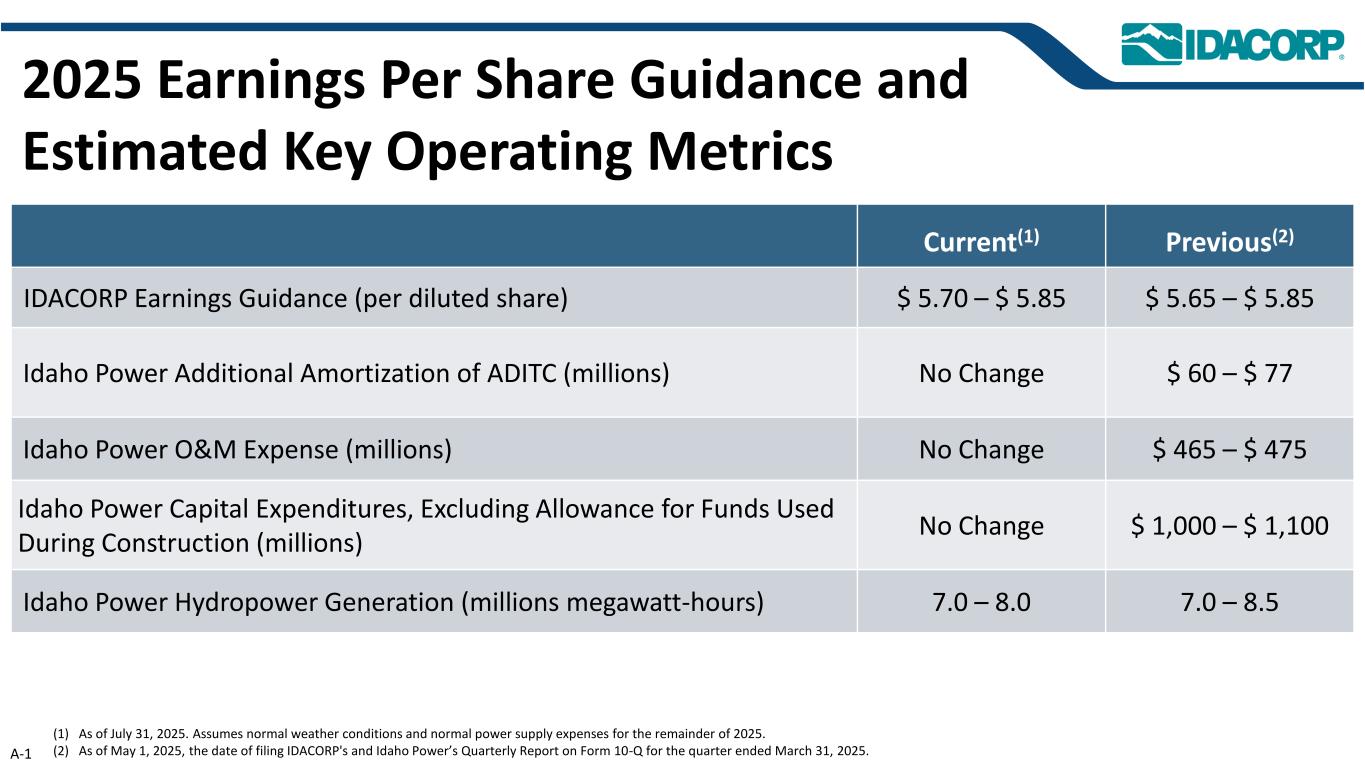 2025年每股收益指引和估计的关键运营指标当前(1)上一(2)次IDACORP收益指引(稀释后每股)5.70美元– 5.85美元5.65美元– 5.85美元爱达荷电力ADITC额外摊销(百万)不变60美元– 77美元爱达荷电力运维费用(百万)不变465美元– 475美元爱达荷电力资本支出,不包括建设期间使用的资金备抵(百万)不变截至2025年7月31日,1,000美元– 1,100美元爱达荷电力水电发电量(百万兆瓦时)7.0 – 8.07.0 – 8.5(1)。假设2025年剩余时间的正常天气条件和正常供电费用。(2)截至2025年5月1日止的2025年3月31日止季度的第10-Q表格季度报告的提交日,即IDACORP及爱达荷电力的提交日。A-1