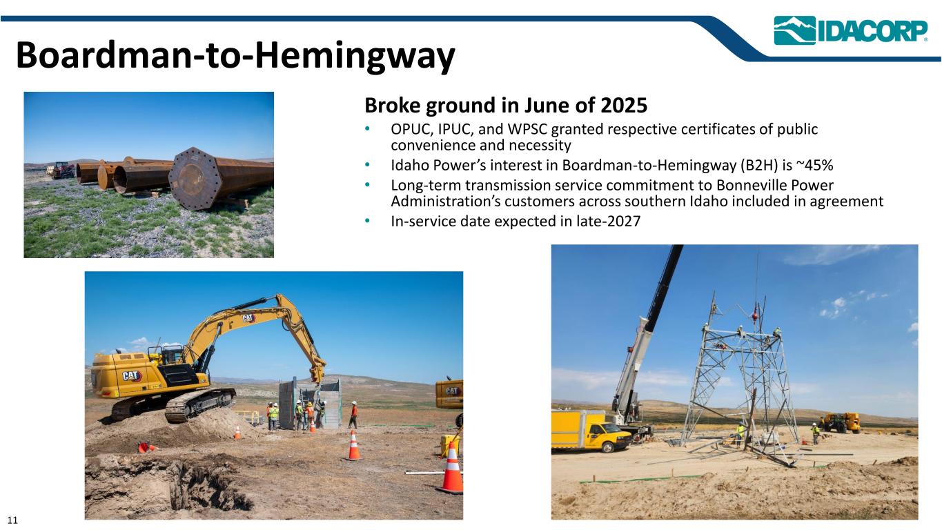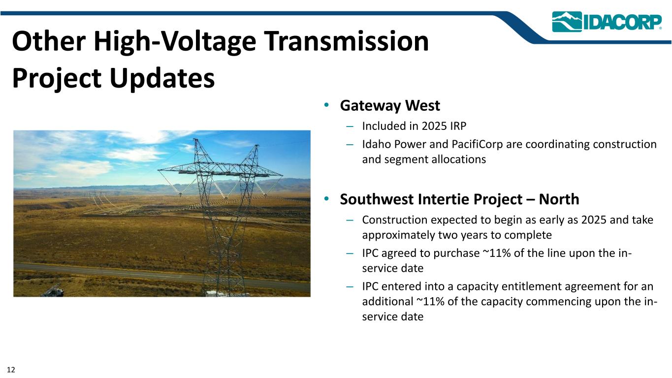 Boardman-to-Hemingway于2025年6月破土• OPUC、IPUC和WPSC分别授予公共便利和必要性证书• Idaho Power在Boardman-to-Hemingway(B2H)中的权益约为45% •对Bonneville Power Administration在爱达荷州南部客户的长期传输服务承诺包含在协议中•预计在2027年末投入使用11
