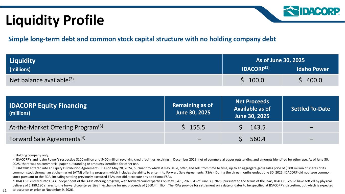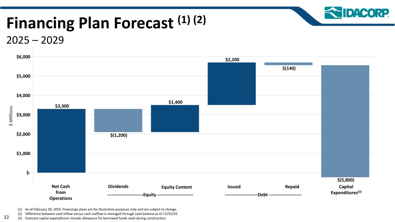 流动性(百万)截至2025年6月30日IDACORP(1)Idaho Power可用净余额(2)$ 100.0 $ 400.0流动性概况(1)仅控股公司。(2)IDACORP和爱达荷电力各自的1亿美元和4亿美元循环信贷额度,将于2029年12月到期,扣除未偿商业票据和确定用于其他用途的金额。截至2025年6月30日,没有未偿还的商业票据或被确定为其他用途的金额。(3)IDACORP于2024年5月20日签订了Equity Distribution协议(EDA),根据该协议,公司可不时通过市场上(ATM)发售计划发行、发售和出售其普通股的总销售总价不超过3亿美元的股份,其中包括签订远期销售协议(FSA)的能力。在截至2025年6月30日的三个月内,IDACORP没有根据EDA发行普通股,包括结算先前执行的FSA,也没有执行任何额外的FSA。(4)IDACORP于2025年5月8日和9日与远期交易对手订立独立于ATM发行计划的FSA。截至2025年6月30日,根据FSA的条款,IDACORP本可以通过向远期交易对手以实物交割5,180,180股股份的方式进行结算,以换取净收益5.604亿美元。FSA规定在一个或多个由IDACORP酌情决定的具体日期进行结算,但预计将在2026年11月9日或之前发生。截至2025年6月30日剩余的IDACORP股权融资(百万)截至2025年6月30日可用的净收益已结算的迄今为止的市场发行计划(3)$ 155.5 $ 143.5 –远期销售协议(4)– $ 56 0.4 –简单的长期债务和普通股资本结构,没有控股公司债务21