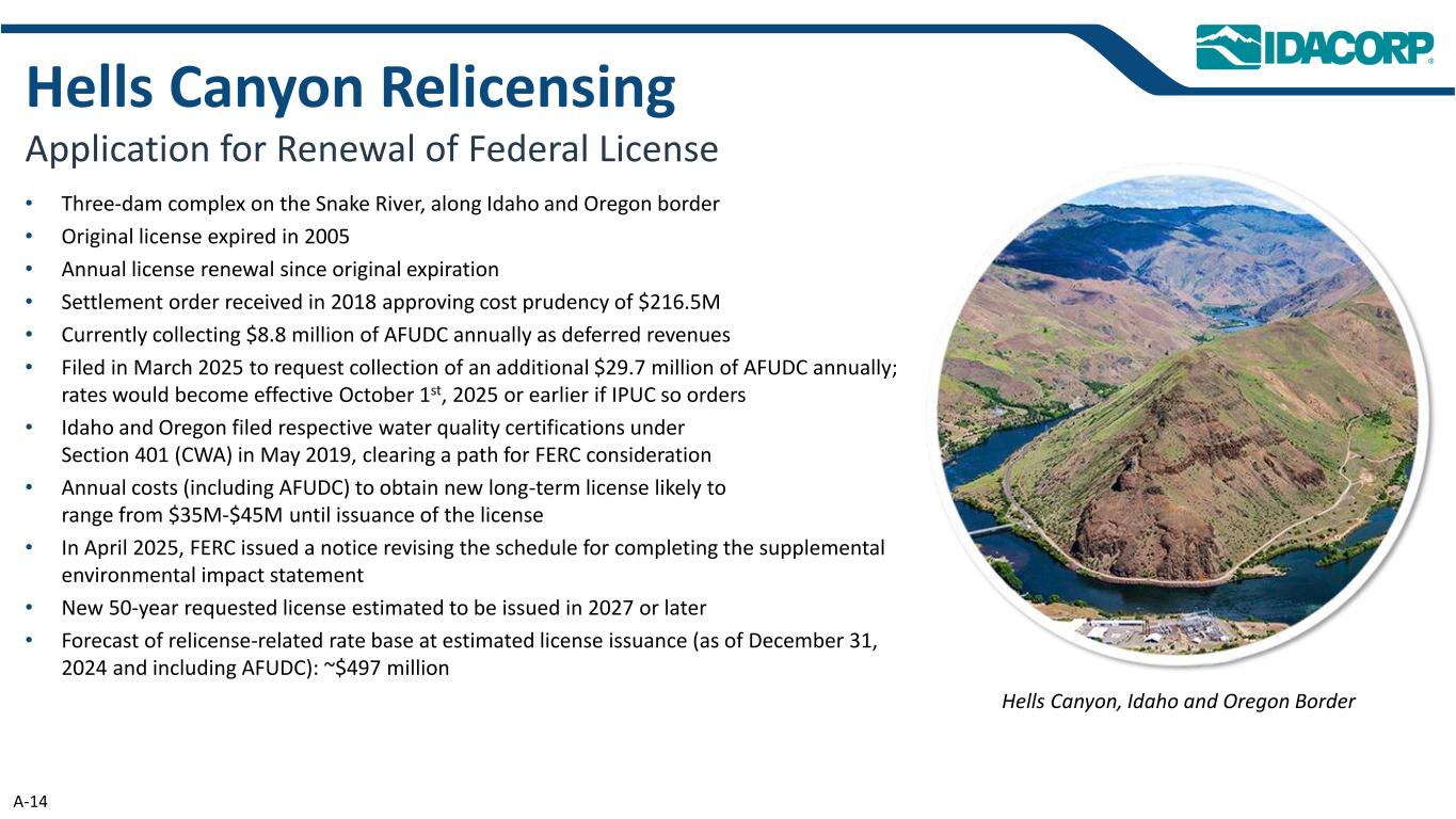 •位于爱达荷州和俄勒冈州边界沿线的Snake River上的三个水坝综合体•原始许可证于2005年到期•自原始到期以来每年更新许可证• 2018年收到的结算令,批准2.165亿美元的成本审慎•目前每年收取880万美元的AFUDC作为递延收入•于2025年3月提交申请,要求每年额外收取2970万美元的AFUDC;如果IPUC这样做,费率将于2025年10月1日或更早生效•爱达荷州和俄勒冈州于2019年5月根据第401条(CWA)分别提交了水质认证,为FERC考虑扫清道路•在许可证发放之前,获得新的长期许可证的年度成本(包括AFUDC)可能在3500万美元至4500万美元之间• 2025年4月,FERC发布了一份通知,修订了完成补充环境影响声明的时间表•新的50年期请求许可证估计将于2027年或更晚发放•在估计许可证发放时(截至2024年12月31日,包括AFUDC)的再许可相关费率基数预测:约4.97亿美元地狱峡谷再许可申请更新联邦许可证地狱峡谷、爱达荷州和俄勒冈州边境A-14