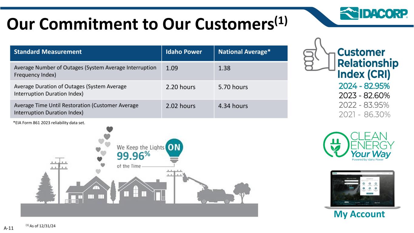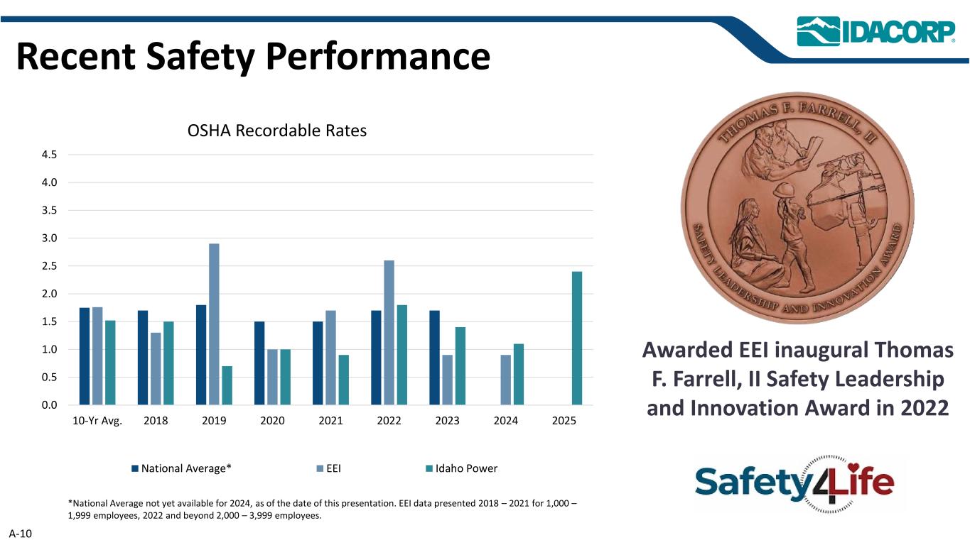 A-10近期安全表现荣获EEI首届Thomas F. Farrell,20220.0 0.5 1.0 1.5 2.0 2.5 3.0 3.54.04.5 10年平均安全领导和创新奖。201820192020202120222022202320242025 OSHA可记录费率全国平均*EEI爱达荷电力*截至本报告发布之日,尚未获得2024年全国平均水平。EEI数据显示,2018 – 2021年为1,000 – 1,999名员工,2022年及以后为2,000 – 3,999名员工。