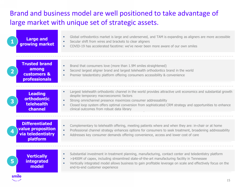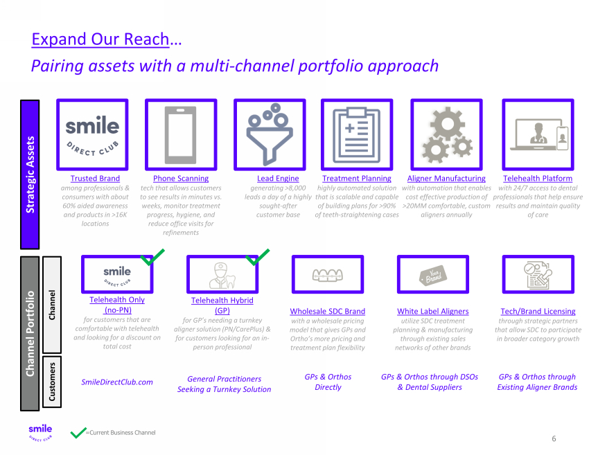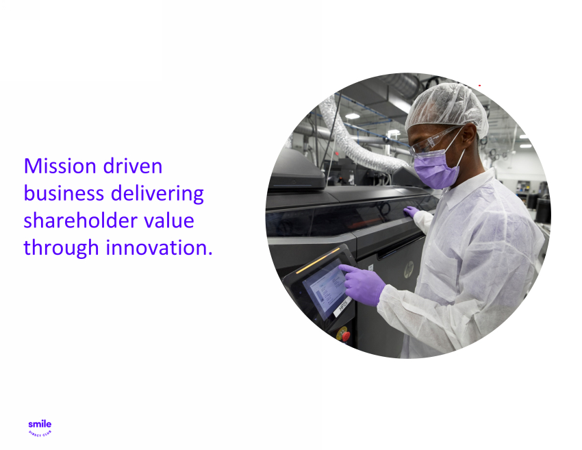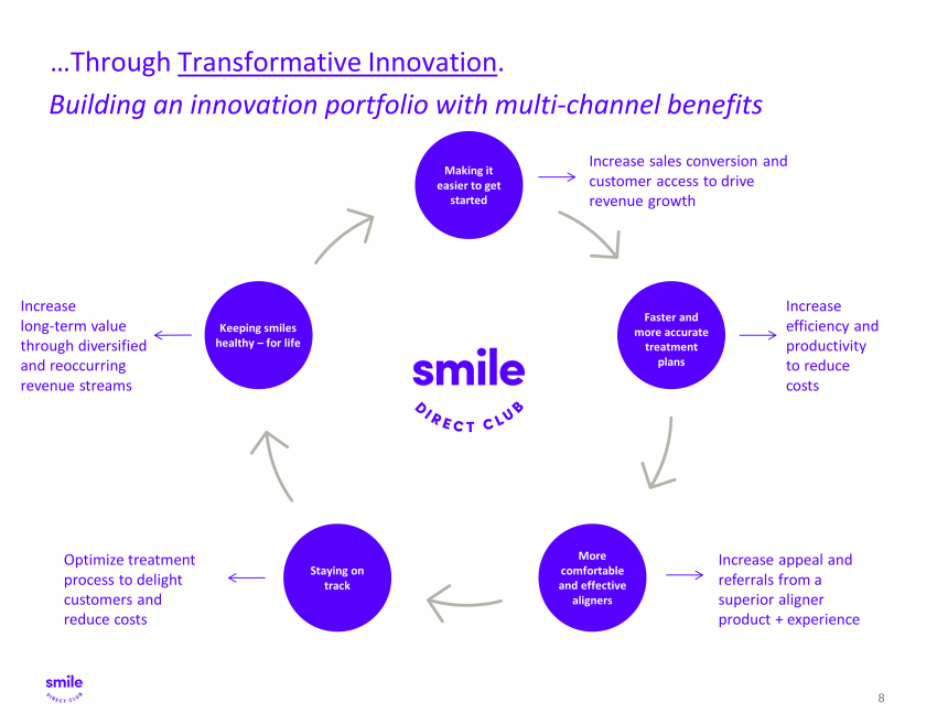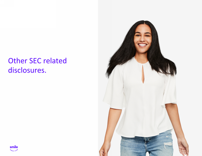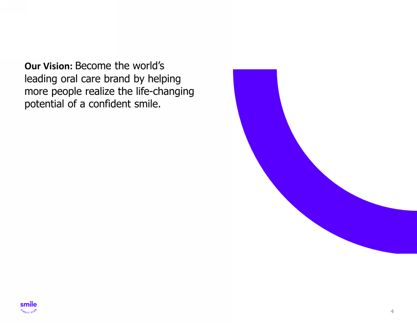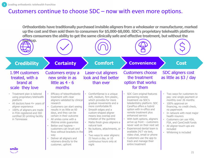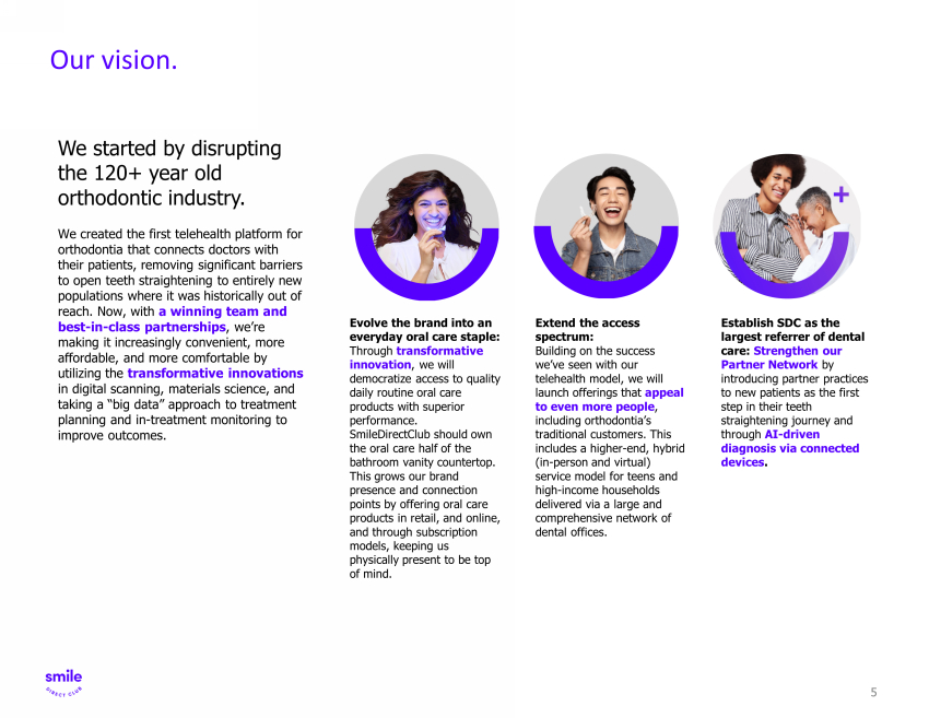 我们从颠覆有120多年历史的正畸行业开始。我们创建了第一个将医生与患者联系起来的牙齿矫正远程医疗平台,消除了向历史上触手可及的全新人群开放牙齿矫正的重大障碍。现在,凭借一支成功的团队和一流的合作伙伴关系,我们正在利用数字扫描、材料科学领域的变革性创新,以及在治疗计划和治疗监测中采用“大数据”方法来改善治疗效果,从而让治疗变得越来越方便、更实惠、更舒适。将品牌发展成为日常口腔护理的主食:通过变革性创新,我们将普及优质日常口腔护理产品,并提供卓越的性能。SmileDirectClub应该拥有口腔护理一半的浴室梳妆台。通过在零售、在线和订阅模式中提供口腔护理产品,这增加了我们的品牌影响力和连接点,让我们的身体处于最佳状态。扩大准入范围:在远程医疗模式取得成功的基础上,我们将推出吸引更多人的产品,包括正畸的传统客户。这包括通过庞大而全面的牙科诊所网络为青少年和高收入家庭提供更高端的混合(面对面和虚拟)服务模式。将SDC确立为牙科护理的最大推荐人:通过向新患者介绍合作伙伴实践,作为他们牙齿矫正之旅的第一步,以及通过联网设备进行AI驱动的诊断,加强我们的合作伙伴网络。我们的愿景。5