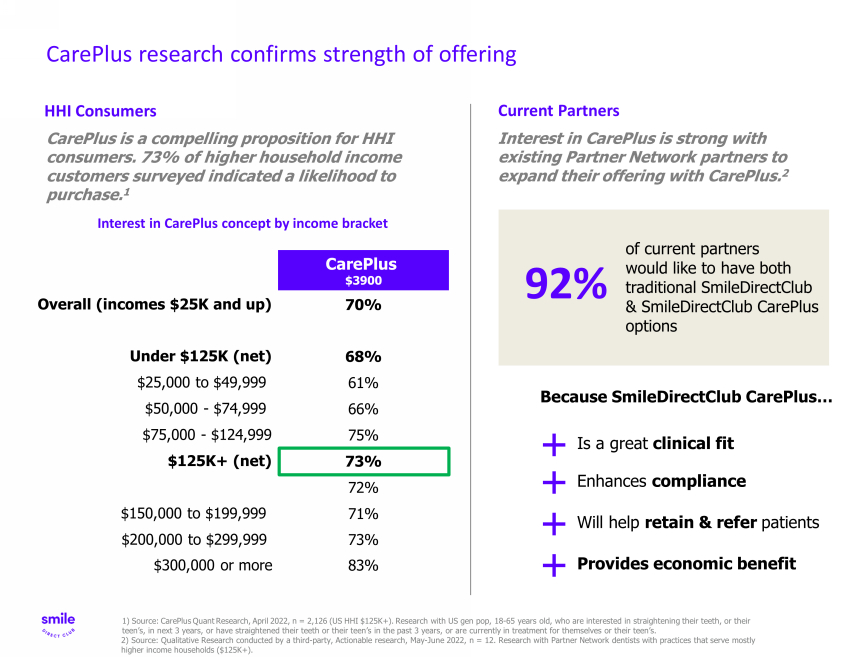CarePlus $ 3900总体(收入$ 25K及以上)70% $ 125K以下(净)68% $ 25000至$ 49,99961% $ 50,000-$ 74,99966% $ 75,000-$ 124,99975% $ 125K +(净)73% 72% $ 150,000至$ 199,99971% $ 200,000至$ 299,99973% $ 300,000或以上83% CarePlus研究证实提供CarePlus的实力对HHI消费者来说是一个有吸引力的提议。在接受调查的高收入家庭客户中,有73%的人表示有购买的可能性。1)资料来源:CarePlus Quant Research,2022年4月,n = 2,126(US HHI $ 125K +)。研究对象为18-65岁的美国流行音乐爱好者,他们有兴趣在未来3年内矫正自己或青少年的牙齿,或者在过去3年内矫正过自己或青少年的牙齿,或者目前正在为自己或青少年治疗。2)资料来源:第三方开展的定性研究,Actionable research,2022年5月至6月,n = 12。与合作伙伴网络牙医的研究,这些牙医主要服务于高收入家庭(12.5万美元以上)。对CarePlus概念的兴趣(按收入等级划分)对CarePlus的兴趣与现有的合作伙伴网络合作伙伴有很强的关系,以扩大他们与CarePlus的合作。292%的现有合作伙伴希望同时拥有传统的SmileDirectClub和SmileDirectClub两种选择CarePlus是一个非常适合临床的选择,因为SmileDirectClub CarePlus…提高依从性将有助于留住和转诊患者提供经济效益HHI消费者当前合作伙伴