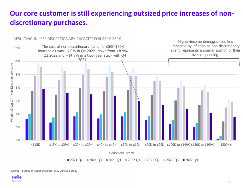 3636我们的核心客户仍在经历非自主采购的超大规模价格上涨。减少50K至69K美元的自由裁量能力资料来源:美国劳工统计局,美国人口普查局4% 5% 6% 7% 8% 9% 10% 11% < $ 15K $ 15K to $ 29K $ 30K to $ 39K $ 40K to $ 49K $ 50K to $ 69K $ 70K to $ 99K $ 100K to $ 149K $ 150K to $ 199K $ 200K + 2021 Q2 2021 Q3 2021 Q4 2022 Q1 2022 Q2 2022 Q3 2022 Q4 Q4 Q4 Household Income Weighted Avg CPI,非全权委托项目2022年第四季度,5万至6.9万美元家庭的非全权委托项目成本为+ 7.0%,低于2022年第三季度的+ 8.9%和2021年第四季度的两年+ 14.8%。受通胀影响较小的高收入人群,因为非可自由支配的支出在他们的总体支出中所占的比例较小。