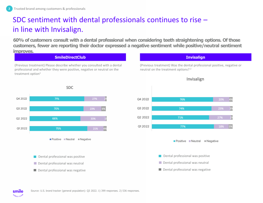 SmileDirectClub(以前的治疗)请说明您是否咨询过牙科专业人士,以及他们对治疗方案1的评价是正面、负面还是中性来源:美国品牌追踪器(普通人群):2022年第三季度。1)399份答复。2)536个回答。Invisalign(既往治疗)牙科专业人员对治疗方案是正面的、负面的还是中性的?2牙科专业人员呈阳性牙科专业人员呈中性牙科专业人员呈阴性牙科专业人员呈阳性牙科专业人员呈中性牙科专业人员呈阴性SDC情绪与牙科专业人员呈持续上升趋势——与Invisalign一致。60%的顾客在考虑矫正牙齿的选择时会咨询牙科专业人士。在这些客户中,报告医生表达了负面情绪的人减少了,而积极/中性的情绪有所改善。2在客户和专业人士中值得信赖的品牌