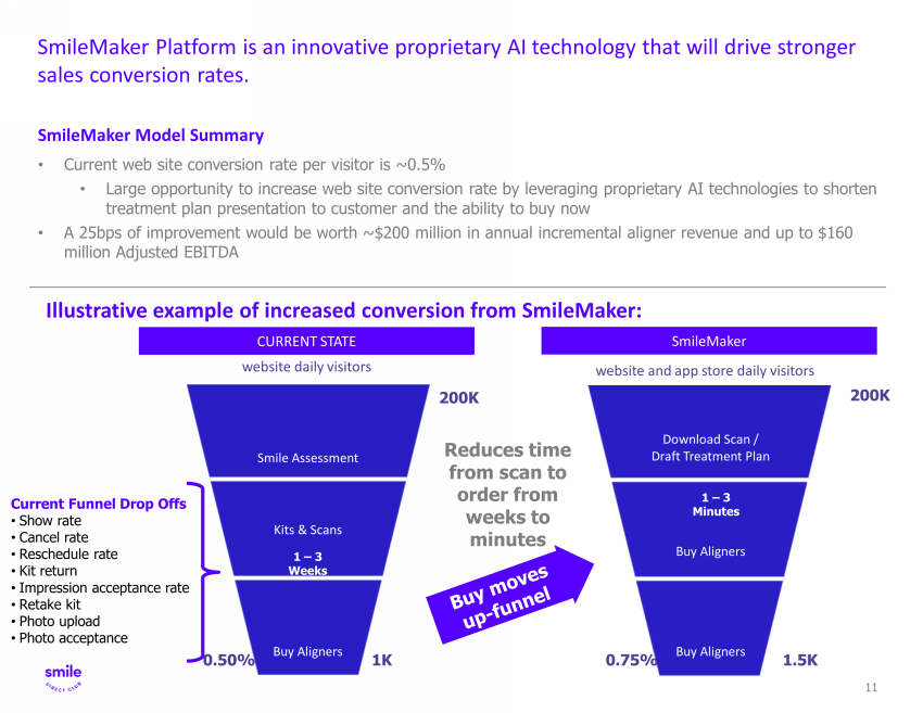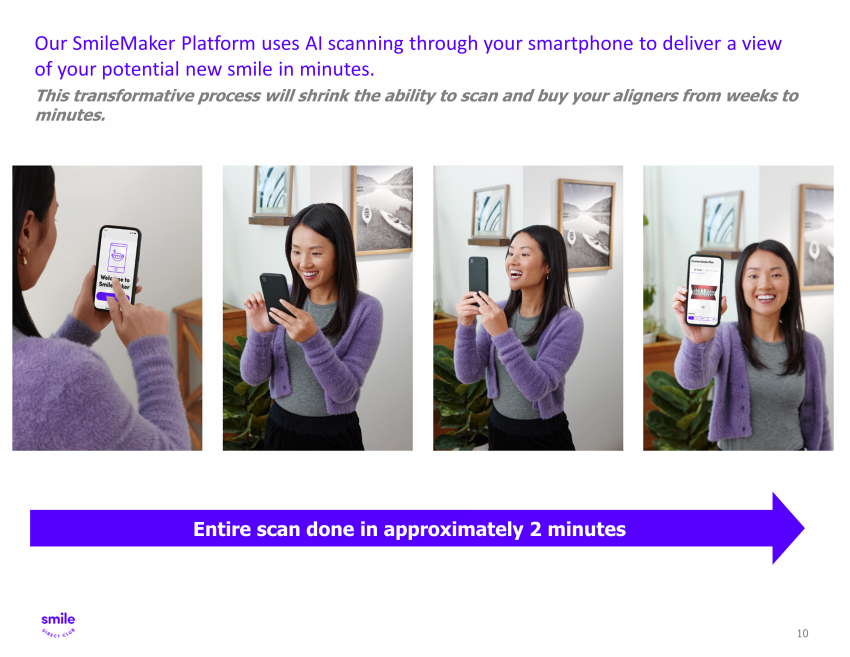 10我们的SmileMaker平台通过智能手机进行AI扫描,可以在几分钟内看到你潜在的新微笑。这个变革性的过程将把扫描和购买矫正器的能力从几周缩短到几分钟。整个扫描在大约2分钟内完成