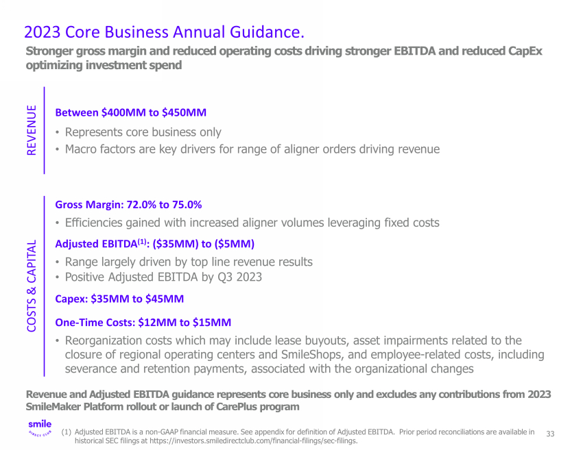 400MM至450MM之间•仅代表核心业务•宏观因素是一系列矫正器订单推动收入增长的关键驱动因素毛利率:72.0%至75.0% •利用固定成本提高矫正器产量所带来的效率调整后EBITDA(1):(35MM)至(5MM)•范围主要由顶线收入业绩推动•到2023年第三季度调整后EBITDA为正值资本支出:35MM至45MM一次性成本:12MM至15MM •重组成本,其中可能包括租赁买断、与关闭区域运营中心和SmileShops相关的资产减值以及与员工相关的成本,包括与组织变革相关的遣散费和保留费COSTS & CAPITAL 332023核心业务年度指导。毛利率提高,运营成本降低,推动EBITDA走强,资本支出减少,优化投资支出收入和调整后EBITDA指引仅代表核心业务,不包括2023年SmileMaker平台推出或CarePlus计划推出的任何贡献(1)调整后EBITDA是一项非公认会计准则财务指标。调整后EBITDA的定义见附录。前期调节可在SEC的历史文件中查阅,网址为https://investors.smiledirectclub.com/financial-filings/sec-filings。