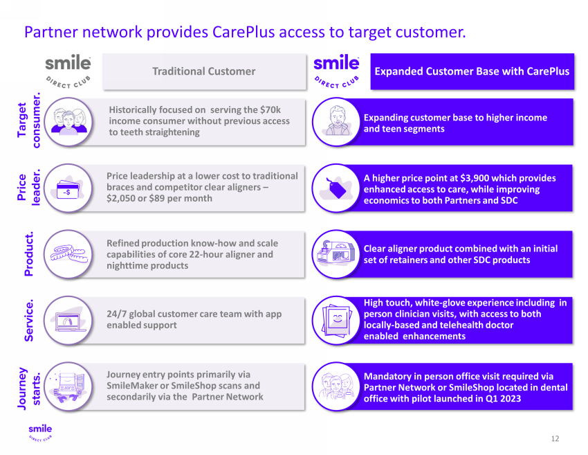精制的生产技巧-核心的22小时校准器和夜间产品的精制和扩展能力Clear校准器产品与一套初始的保持器和其他SDC产品相结合价格领先,成本低于传统的牙套和竞争对手的透明校准器-每月2,050或89美元更高的价格为3,900美元,提供更多的护理机会,同时提高合作伙伴和SDC的经济效益历史上专注于为7万美元收入的消费者提供服务,而无需之前获得牙齿矫正将客户群扩展到更高收入和青少年群体,24/7全球客户服务团队提供应用支持高接触、白手套体验,包括亲自去看临床医生,同时获得本地和远程医疗医生支持的增强服务旅程入口点主要通过SmileMaker或SmileShop扫描,其次通过合作伙伴网络合作伙伴网络为CarePlus提供对目标客户的访问。CarePlus 12扩大了传统客户基础强制要求通过合作伙伴网络或位于牙科诊所的SmileShop亲自上门拜访,试点于2023年第一季度启动