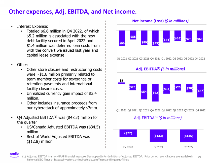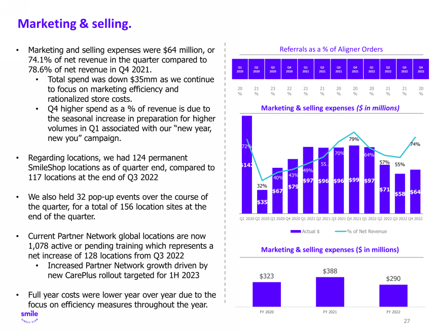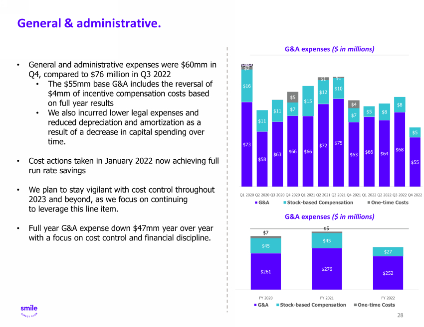 •营销和销售费用为6400万美元,占本季度净营收的74.1%,而2021年第四季度为78.6%。•总支出减少了35毫米,因为我们继续关注营销效率和合理化的商店成本。•第四季度支出占收入的百分比增加,是由于我们的“新年,新的你”活动为第一季度销量增加做准备的季节性增加。•关于地点,截至季度末,我们有124个永久的SmileShop地点,而2022年第三季度末为117个地点•我们在本季度还举办了32个弹出式活动,截至本季度末,共有156个地点地点。•目前合作伙伴网络的全球地点现在有1078个正在进行或即将进行的培训,比2022年第三季度净增加128个地点•合作伙伴网络增长加快,原因是计划在2023年上半年推出新的CarePlus •由于全年注重效率措施,全年费用同比下降。$ 142 $ 35 $ 67 $ 79 $ 97 $ 96 $ 96 $ 99 $ 97 $ 71 $ 58 $ 6472% 32% 40% 43% 49% 55…70% 79% 64% 64% 57% 55% 74% Q1 2020 Q2 2020 Q3 2020 Q4 2020 Q1 2021 Q2 2021 Q3 2021 Q4 2021 Q4 2021 Q1 2022 Q2 2022 Q3 2022 Q4 2022 Actual $ % of Net Revenue 27 Marketing & Saleting expenses($ millions)Q1 2020 Q2 2020 Q3 2020 Q4 2020 Q1 2021 Q2 2021 Q3 2021 Q4 2021 Q1 2022 Q2 2022 Q3 2022 Q4 2022 Q4 2022 20% 21% 23% 22% 21% 21% 21% 21% 21% 21% 21% 21% 21% 21% 21% 21% 21% 21% 21% 21% 21% 21% 21% 21% 21% 21% 21% 21% 21% 21% 21% 21% 21% 21% 21% 21% 21% 21% 21% 21% 21% 21% 21% 21% 21%20% 20% 20% 21% 21% 20% 27推荐占Aligner Orders Marketing & selling的百分比。$ 323 $ 388 $ 290 FY 2020 FY 2021 FY 2022营销和销售费用(百万美元)