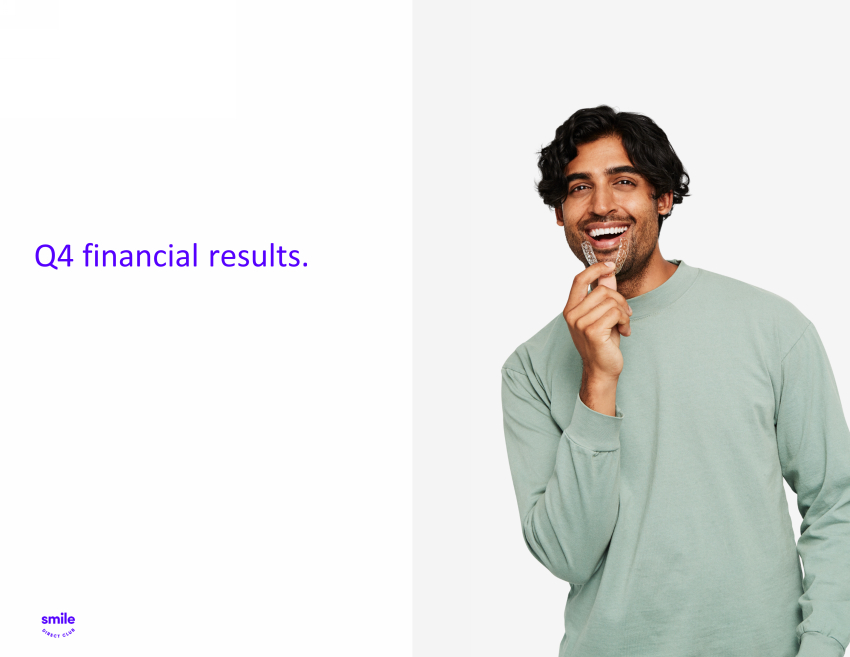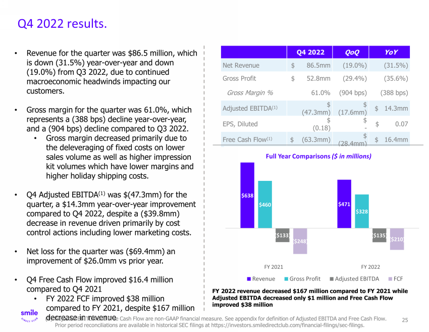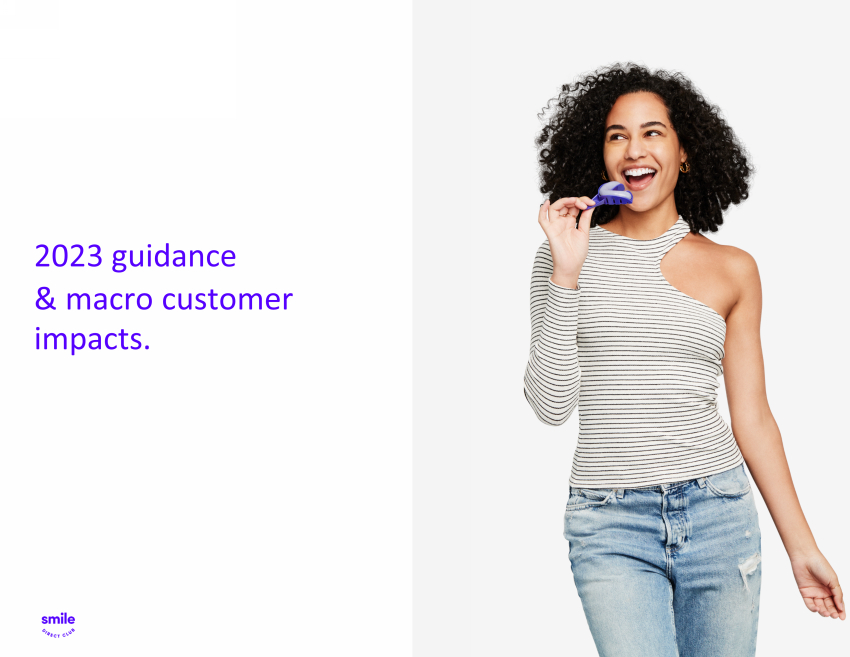 2前瞻性陈述本演示文稿包含前瞻性陈述。除历史事实以外的所有陈述都可能是前瞻性陈述。前瞻性陈述一般与未来事件有关,包括但不限于对我们业务的可能或假定的未来结果、财务状况、流动性、业务结果、计划和目标的预测、预测和估计。其中一些国家可能包括“预期”、“预期”、“相信”、“估计”、“目标”、“计划”、“潜力”、“打算”、“项目”和“指示”等词。尽管这些前瞻性陈述反映了我们当前的善意预期,但它们并不能保证未来的业绩,而且涉及许多难以预测的风险、不确定性、估计和假设。可能导致实际结果和结果与前瞻性陈述中表达或暗示的结果和结果存在重大差异的一些因素包括但不一定限于:目前不遵守《纳斯达克上市规则》规定的最低投标要求;新冠疫情的持续时间和规模以及相关的遏制措施;我们对增长的管理;我们的业务战略的执行、新举措的实施以及效率的提高;我们的销售和营销工作;我们的制造能力和业绩,和成本;我们获得未来监管批准的能力;我们的财务估计和对额外融资的需求;消费者对我们明确的校准器的接受和竞争;我们与零售合作伙伴和保险公司的关系;我们的研发、商业化以及其他活动和支出;我们用于编制财务报表和做出商业决策的方法、模型、假设和估计,管理风险;管理远程医疗和牙科实践的法律法规;我们与供应商的关系;我们的操作系统和基础设施的安全性;我们的风险管理框架;我们的现金和资本需求;我们的知识产权状况;我们面临的索赔和法律诉讼风险;以及我们提交给美国证券交易委员会的文件中描述的其他因素,包括但不限于我们截至2022年12月31日止年度的10-K表格年度报告。新的风险和不确定性随着时间的推移而出现,我们不可能预测所有这些因素或它们可能如何影响我们。你不应过分依赖前瞻性陈述,这些陈述只在陈述之日起生效。我们没有义务在本演示文稿发布之日之后更新任何这些前瞻性陈述,以使这些陈述符合实际结果或修订后的预期。因此,您不应依赖这些前瞻性陈述来代表我们在本演示文稿日期之后的任何日期的观点。市场和行业数据本演示文稿还包含从独立方和我们获得的有关市场规模和增长的估计和其他统计数据,以及关于我们的行业和最终消费者的其他数据。这些数据涉及到许多假设和限制,你必须小心谨慎,不要对这些估计和数据给予过高的权重。此外,对我们未来业绩的预测、假设和估计,以及我们经营所在的地理和其他市场的未来业绩,必然会受到高度的不确定性和风险的影响。我们在我们的网站上提供有关我们的营销声明的额外的di scl保证,该网站可以在smiledirectclub.com/claims/上找到。非GAAP财务指标本演示文稿包含某些非GAAP财务指标,包括调整后EBITDA(“调整后EBITDA”)和自由现金流。我们利用某些非公认会计原则的衡量标准,包括调整后的EBITDA和自由现金流来评估我们的实际经营业绩,并对未来期间进行规划和预测。这些非GAAP衡量标准不应被孤立地考虑,也不应作为相关GAAP衡量标准的替代品,其他公司可能会对此类衡量标准做出不同的定义。我们提供了这些非GAAP财务指标与最直接可比的GAAP财务指标的对账,见本演示文稿的附录,以及我们公布季度收益结果的8-K表格当前报告,该报告可在SEC网站www.sec. gov和我们的投资者网站smiledirectclub.com上找到。我们不提供前瞻性调整后EBITDA与最直接可比的GAAP财务指标(净亏损)的对账,因为可变性导致无法获得与相应GAAP指标的对账, 不包括在前瞻性调整后EBITDA中的非现金项目的复杂性和有限的可见性。本演示文稿是对SmileDirectClub发布的截至2022年12月31日的季度收益报告的补充,应与该报告一起阅读。