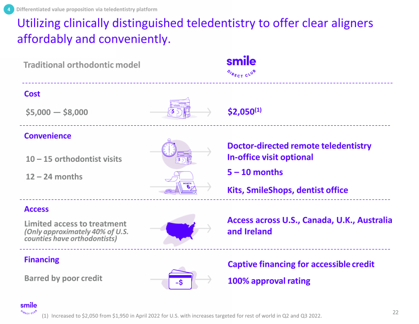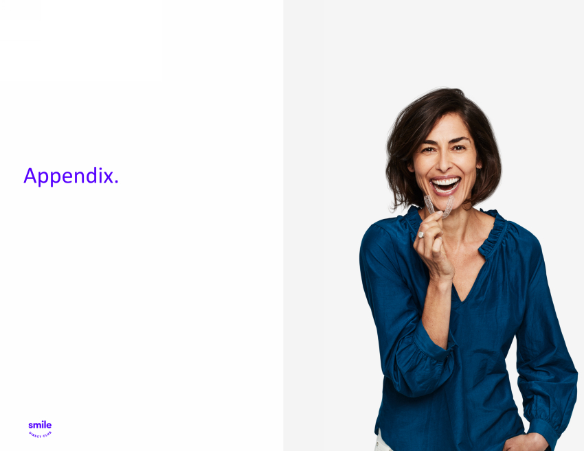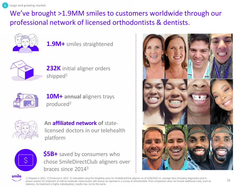 通过我们的专业正畸和牙医网络,我们为世界各地的顾客带来了超过1.9MM的微笑。16232K初始校准器订单已发货1个190万+微笑已拉直一个附属的国家特许医生网络在我们的远程医疗平台每年生产1000万+ ligners托盘21)2022年发货。2)2022年生产。3)使用截至2022年4月20日的SmileDirectClub矫正器的SinglePay价格与一项正畸医生调查中报告的治疗轻度至中度牙套错牙症的平均费用(包括诊断和亲自检查)进行比较。价格比较儿子不包括额外的成本,如保留者。由于治疗是高度个体化的,结果可能并不相同。自2014年以来,选择SmileDirectClub矫正器而不是牙套的消费者节省了5B +美元31庞大且不断增长的市场