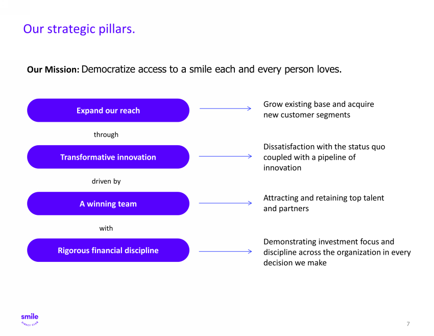 将资产与多渠道组合方法相结合6扩大我们的影响力…在专业人士和消费者中值得信赖的品牌,拥有约60%的辅助意识,产品分布在超过16K个地点Lead Engine每天产生超过8,000条线索,这是一个备受追捧的客户基础Treatment Planning高度自动化的解决方案,该解决方案可扩展,能够为超过90%的牙齿矫正案例制定计划Aligner Manufacturing with automation,可使> 20MM舒适的生产具有成本效益,定制矫正器远程医疗平台,每天24小时与牙科专业人员联系,帮助确保结果并保持护理质量电话扫描技术,让客户在几分钟而不是几周内就能看到结果,监测治疗进度和卫生状况,并减少办公室访问以改进战略资产渠道组合仅远程医疗(无-PN),适用于对远程医疗感到满意并希望获得总成本折扣的客户通过战略合作伙伴获得技术/品牌授权,使SDC能够参与更广泛的类别增长白标对齐器利用SDC治疗规划和制造,通过其他品牌的现有销售网络批发SDC品牌,采用批发定价模式这使全科医生和Ortho的定价和治疗方案更具灵活性Telehealth Hybrid(GP)适用于需要交钥匙校准器解决方案的全科医生(PN/CarePlus)&适用于寻求面对面专业渠道的客户客户客户SmileDirectClub.com寻求交钥匙解决方案的全科医生和Orthos直接通过DSO和牙科供应商提供的全科医生和Orthos =当前业务渠道的全科医生和通过现有校准器品牌提供的Orthos