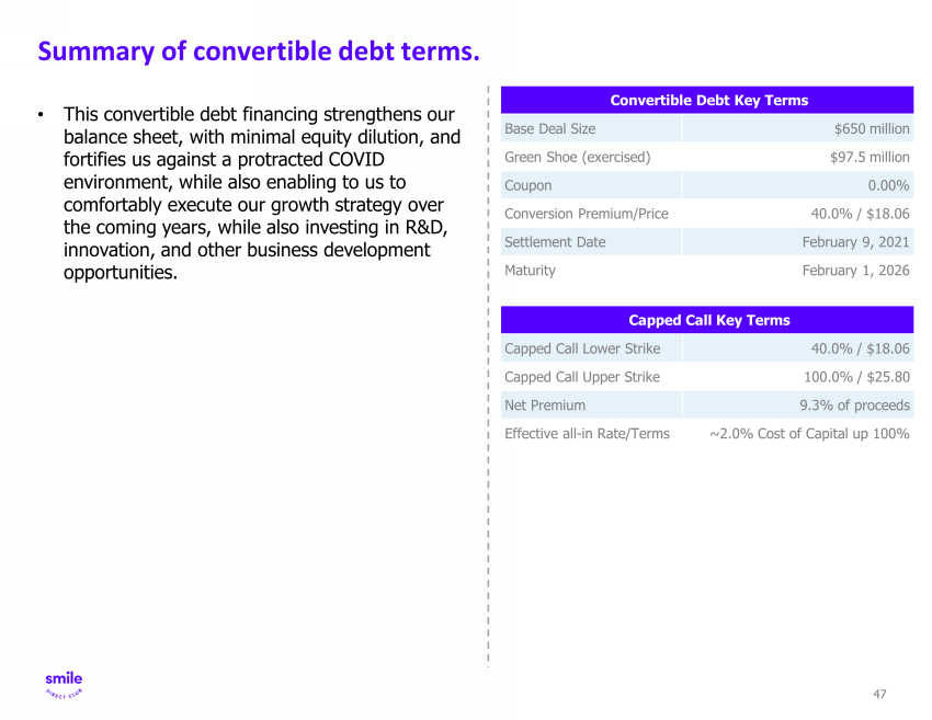 •这种可转换债券融资加强了我们的资产负债表,将股权稀释降至最低,使我们能够抵御长期的新冠疫情环境,同时使我们能够在未来几年轻松地执行我们的增长战略,同时还投资于研发、创新和其他商业发展机会。47可转债关键条款基础交易规模6.5亿美元Green Shoe(已行使)9750万美元票息0.00%转换溢价/价格40.0%/18.06美元结算日期2021年2月9日到期2026年2月1日上限认购关键条款上限认购更低行使价40.0%/18.06美元上限认购更高行使价100.0%/25.80美元净溢价9.3%收益有效全入率/条款~2.0%资本成本上涨100% 47可转债条款摘要。