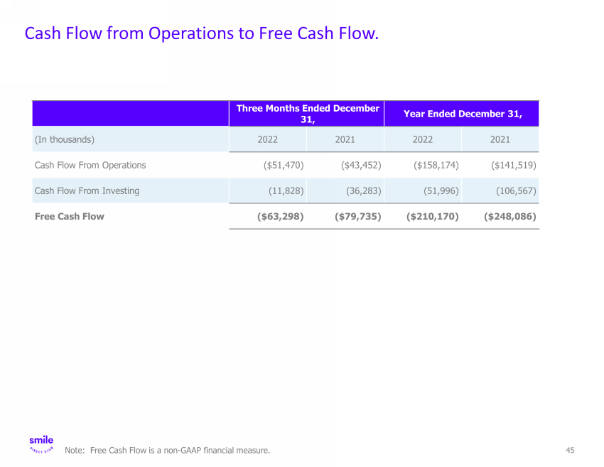 45截至12月31日的三个月,截至12月31日的年度,(千)2022202120222021运营现金流(51,470美元)(43,452美元)(158,174美元)(141,519美元)投资现金流(11,828美元)(36,283美元)(51,996美元)(106,567美元)自由现金流(63,298美元)(79,735美元)(210,170美元)(248,086美元)注:自由现金流是一种非公认会计原则的财务指标。经营活动产生的现金流量转为自由现金流量。