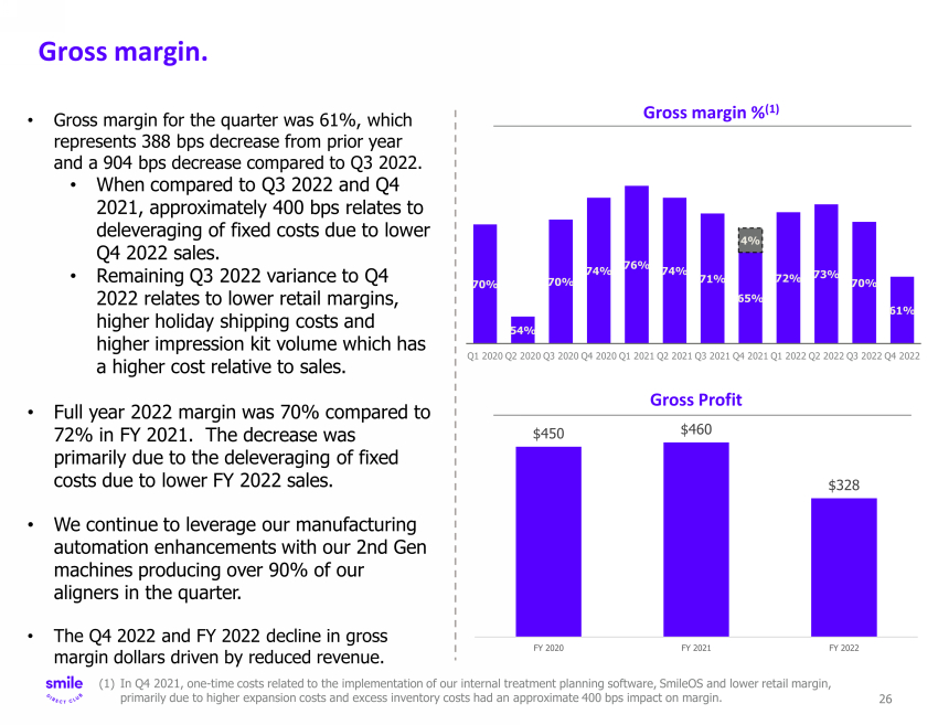 $ 638 $ 471 $ 460 $ 328($ 133)($ 135)($ 248)($ 210)FY 2021 FY 2022 FY FY Revenue Gross Profit Adjusted EBITDA FCF 25 Q4 2022 QoQ YoY Net Revenue $ 86.5mm(19.0%)(31.5%)Gross Profit $ 52.8mm(29.4%)(35.6%)Gross Margin % 61.0%(904 bps)(388 bps)Adjusted EBITDA(1)$(47.3mm)$(17.6mm)$ 14.3mm EPS,Diluted $(0.18)$-$ 0.07 Free Cash Flow(1)$(63.3mm)$(28.4mm)$ 16.4mm • The revenue of the quarter was $ 8650万,which was down(31.5%)由于持续的宏观经济逆风影响我们的客户。•本季度毛利率为61.0%,同比下降(388个基点),与2022年第三季度相比下降(904个基点)。•毛利率下降的主要原因是,由于销售量减少,固定成本减少,以及印模套件量增加,利润率较低,假日运输费用较高。•第四季度调整后EBITDA(1)为(47.3毫米)美元,与2022年第四季度相比,同比增长14.3毫米,尽管收入下降(39.8毫米),主要是由于成本控制措施,包括降低营销成本。•本季度净亏损为(69.4毫米),比上年增加26.0毫米。•与2021年第四季度相比,第四季度自由现金流增加了1640万美元•尽管收入减少了1.67亿美元,但与2021年相比,2022财年的FCF增加了3800万美元。全年比较(百万美元)2022财年的收入与2021年相比减少了1.67亿美元,而调整后的EBITDA仅减少了100万美元,自由现金流增加了3800万美元。(1)调整后的EBITDA和自由现金流是非GAAP财务指标。调整后EBITDA和自由现金流的定义见附录。前期调节可在SEC的历史文件中查阅,网址为https://investors.smiledirectclub.com/financial-filings/sec-filings。