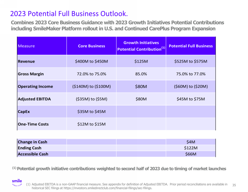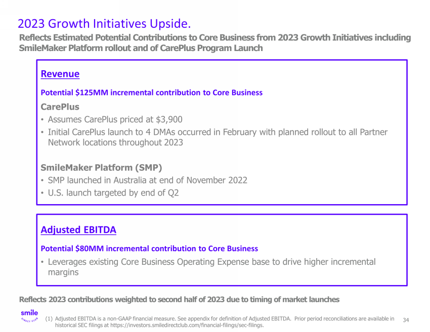 收入潜力$ 125MM对核心业务的增量贡献CarePlus •假设CarePlus定价为3900美元• CarePlus于2月首次向4个DMA推出,计划在整个2023年期间向所有合作伙伴网络地点推出SmileMaker Platform(SMP)• SMP于2022年11月底在澳大利亚推出•目标在第二季度末在美国推出调整后EBITDA潜力$ 80MM对核心业务的增量贡献•利用现有的核心业务运营费用基础推动更高的增量利润率342023增长举措的上行空间。反映2023年增长计划对核心业务的估计潜在贡献,包括SmileMaker平台的推出和CarePlus计划的启动反映了由于市场启动的时间,2023年的贡献加权到2023年下半年(1)调整后的EBITDA是非公认会计准则财务指标。调整后EBITDA的定义见附录。前期调节可在SEC的历史文件中查阅,网址为https://investors.smiledirectclub.com/financial-filings/sec-filings。