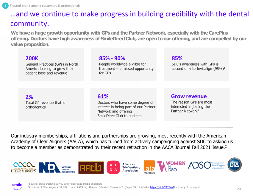 1资料来源:Aegis贸易媒体出版商品牌跟踪调查2 Academy of Clear Aligners Fall 2021 Issue:AACA Digs Deeper。11月1日发布。(第10、12页)请访问:https://bit.ly/3CITzsd,获取一份报告:北美20个200K全科医生希望扩大患者基础和收入2%全科医生总收入是正畸85%-90 %全球范围内有资格接受治疗的人——全科医生错失的机会85% SDC对全科医生的认知度仅次于Invisalign(95%)161%医生对加入我们的合作伙伴网络并向患者提供SmileDirectClub有一定的兴趣1我们的行业会员、从属关系和合作伙伴关系正在增长,最近加入了美国清晰对齐器学会(AACA),该学会从积极反对SDC转变为要求我们成为会员,最近他们在《AACA期刊2021年秋季刊》上的撤稿就证明了这一点。2增加收入GP对加入合作伙伴网络最感兴趣的原因1我们在GP和合作伙伴网络方面有巨大的增长机会,尤其是在CarePlus产品方面。医生对SmileDirectClub有很高的认知度,对我们的产品持开放态度,并被我们的价值主张所驱使。…而且我们在建立与牙科界的信誉方面继续取得进展。2在客户和专业人士中值得信赖的品牌