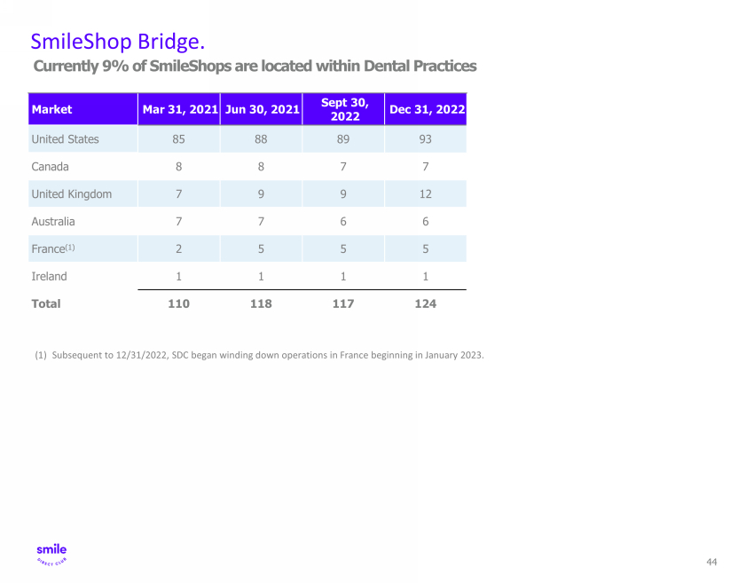 44市场2021年3月31日2021年6月30日2022年9月30日2022年12月31日美国85888993加拿大88777英国79912澳大利亚7766法国(1)2555爱尔兰1111总计110118117124 SmileShop Bridge。目前9%的SmileShops位于牙科诊所(1)在2022年12月31日之后,SDC从2023年1月开始逐步减少在法国的业务。