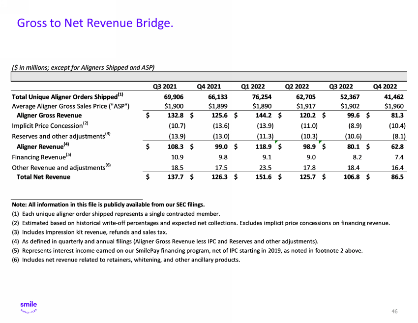 46毛到净收入的桥梁。(百万美元;除Aligners出货量和平均售价外)Q3 2021 Q4 2021 Q1 2022 Q2 2022 Q3 2022 Q4 2022 Q42022 Total Unique Aligner Orders Shipped(1)69,90666,13376,25462,70552,36741,462 Average Aligner Gross Sales Price(“ASP”)$ 1,900 $ 1,899 $ 1,890 $ 1,917 $ 1,902 $ 1,960 Aligner Gross Revenue 13 2.8 $ 125.6 $ 144.2 $ 120.2 $ 99.6 $ 81.3 $ Implicit Price Concession(2)(10.7)(13.6)(13.9)(11.0)(8.9)(10.4)Reserves and other adjustments(和调整(6)18.5 17.52 3.5 17.8 18.4 16.4净收入总额137.7美元126.3美元151.6美元125.7美元106.8美元86.5美元注:此文件中的所有信息均可从我们提交给美国证券交易委员会的文件中公开获取。(1)所发运的每一个独特的校准器订单代表一个单一的订约成员。(2)根据历史注销百分比和预期收款净额估算。不包括对融资收入的隐性价格优惠。(3)包括印象包收入、退款和销售税。(4)季度和年度申报文件中的定义(Aligner总收入减去IPC和储备金及其他调整)。(5)如上文脚注2所述,表示从2019年开始,我们的SmilePay融资计划在扣除IPC后获得的利息收入。(6)包括与保持器、美白和其他辅助产品有关的净收入。