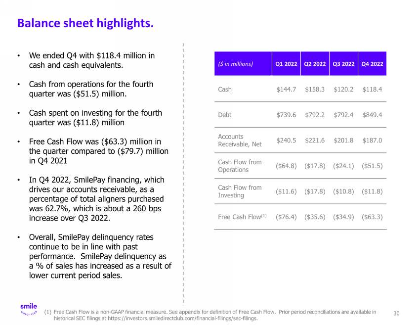 (百万美元)2022年第一季度2022年第二季度2022年第三季度2022年第四季度现金144.7美元158.3美元120.2美元118.4美元债务739.6美元79 2.2美元79 2.4美元849.4美元应收账款净额240.5美元221.6美元201.8美元187.0运营现金流(64.8美元)(17.8美元)(24.1美元)(51.5美元)投资现金流(11.6美元)(17.8美元)(10.8美元)(11.8美元)自由现金流(1美元)(76.4美元)(35.6美元)(34.9美元)(63.3美元)30 •我们在第四季度末拥有1.184亿美元现金和现金等价物。•第四季度的经营活动现金为(51.5)百万美元。•第四季度用于投资的现金为(11.8)百万美元•本季度的自由现金流为(63.3)百万美元,而2021年第四季度为(79.7)百万美元• 2022年第四季度,推动我们应收账款的SmilePay融资占采购对准器总额的比例为62.7%,比2022年第三季度增加了约260个基点。•总体而言,SmilePay拖欠率继续与过去的表现一致。由于本期销售额较低,SmilePay拖欠率占销售额的百分比有所上升。30资产负债表要点。(1)自由现金流是一种非GAAP财务指标。自由现金流的定义见附录。前期调节可在SEC的历史文件中查阅,网址为https://investors.smiledirectclub.com/financial-filings/sec-filings。