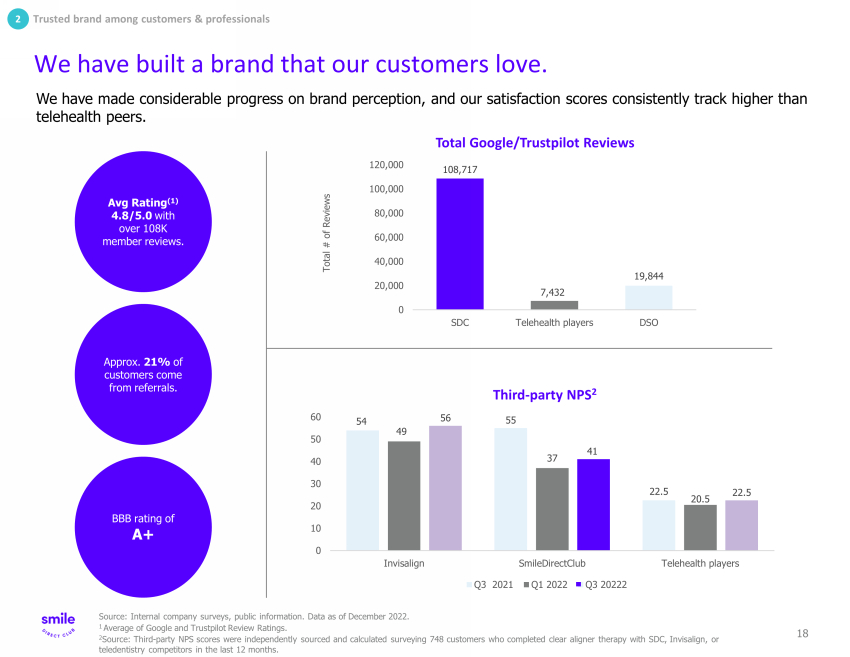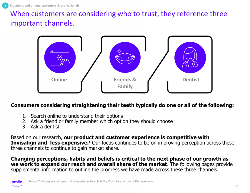 考虑矫正牙齿的17 C消费者通常会做以下一项或全部:1。在网上搜索,了解他们的选择2。问问朋友或家人,他们应该选择哪个选项3。询问牙医根据我们的研究,我们的产品和客户体验比Invisalign更有竞争力,也更便宜。1我们的重点仍然是提高这三个渠道的观感,以继续获得市场份额。改变观念、习惯和信念对我们下一阶段的增长至关重要,因为我们正在努力扩大我们的市场范围和整体份额。以下各页提供补充资料,概述我们在这三个渠道取得的进展。1资料来源:第三方市场研究公司对SmileDirectClub文件的研究;基于1200多名受访者。在线牙医朋友和家人当客户考虑信任谁时,他们会参考三个重要的渠道。2在客户和专业人士中值得信赖的品牌