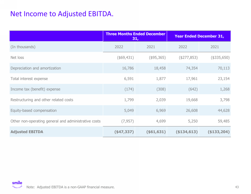 43截至12月31日的三个月,截至12月31日的年度,(单位:千)2022202120222021净亏损(69431美元)(95,365美元)(277,853美元)(335,650美元)折旧和摊销16,78618,45874,35470,113总利息费用6,5911,87717,96123,154所得税(收益)费用(174)(308)(642)1,268重组和其他相关费用1,7992,03919,6683,798股权补偿5,0496,96926,60844,628其他非经营性一般和行政费用(7,957)4,6995,25059,485调整后EBITDA(47,337美元)(61,631美元)(134,613美元)(133,204美元)调整后EBITDA的净收入。