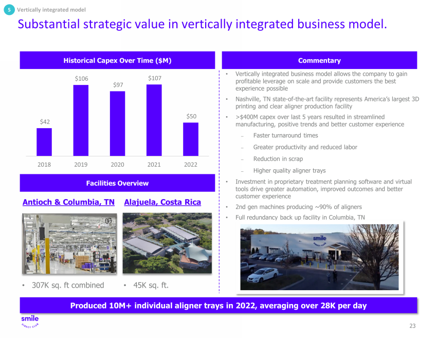 22传统正畸模式费用$ 2,050(1)$ 5,000 — $ 8,000有限的治疗机会(美国只有大约40%的州有正畸医生)美国、加拿大、英国、澳大利亚和爱尔兰的治疗机会5 – 10个月12 – 24个月10 – 15个正畸医生就诊医生指导的远程远程牙科在办公室就诊可选的便利性不受信用不良的限制为可获得的信贷提供专属融资100%的认可评级融资工具包、微笑商店、牙医诊所利用临床上杰出的远程牙科,以经济和方便的方式提供清晰的矫正器。(1)美国从2022年4月的1950美元增加到2050美元,世界其他地区计划在2022年第二季度和第三季度增加。4通过远程医疗平台实现差异化的价值定位