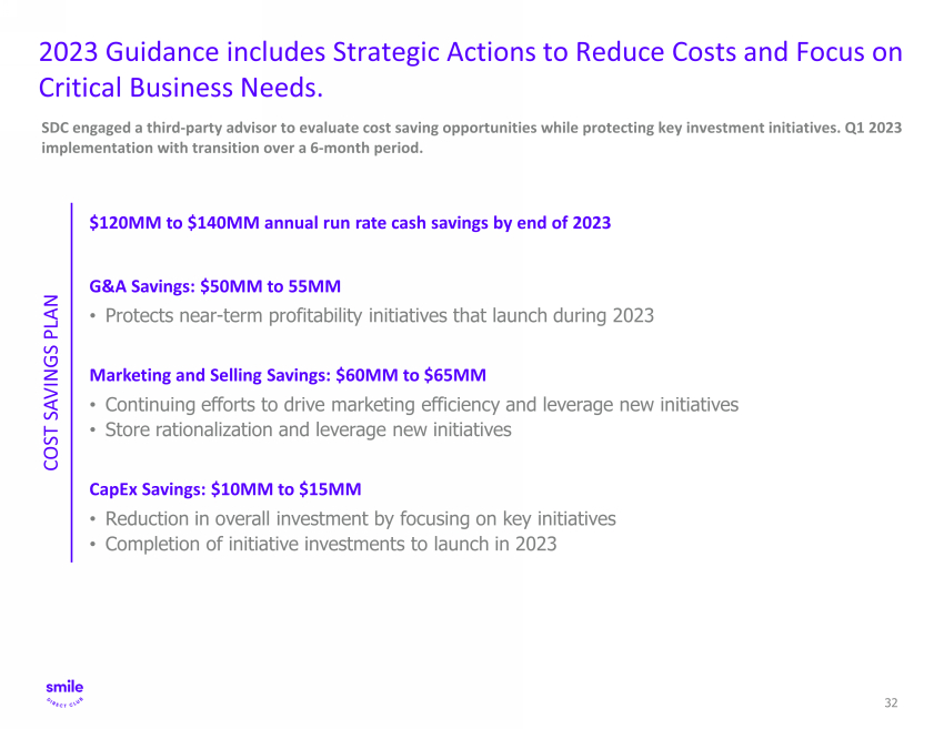 2023年指南包括降低成本和关注关键业务需求的战略行动。32 SDC聘请了一名第三方顾问来评估节省成本的机会,同时保护关键的投资计划。2023年第一季度实施,过渡期为6个月。到2023年底,每年可节省120MM至140MM的现金支出:50MM至55MM •保护2023年推出的近期盈利举措营销和销售节省:60MM至65MM •继续努力提高营销效率并利用新举措•商店合理化并利用新举措资本支出节省:10MM至15MM •通过专注于关键举措减少总体投资•完成将于2023年推出的举措投资成本节约计划