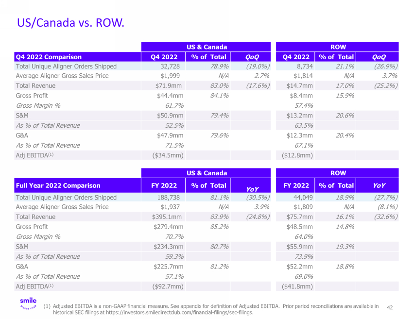 42美国和加拿大ROW 2022年第四季度比较2022年第四季度占总订单的百分比2022年第四季度占总订单的百分比唯一对准器总订单出货量32,72878.9%(19.0%)8,73421.1%(26.9%)平均对准器总销售价格$ 1,999不适用2.7% $ 1,814不适用3.7%总收入$ 71.9mm83.0 %(17.6%)$ 14.7mm17.0 %(25.2%)毛利润$ 44.4mm84.1 % $ 8.4mm15.9 %毛利率% 61.7% 57.4% S & M $ 50.9m79.4% $ 13.2m20.6 % As % of Total Revenue 52.5% 63.5% G & A $ 47.9mm79.6 % $ 12.3mm20.4 % As % of Total Revenue 71.5% 67.1% Adj EBITDA(1)($ 34.5m(1)调整后的EBITDA是一种非GAAP财务指标。调整后EBITDA的定义见附录。在历史上提交给美国证券交易委员会的文件中,可以找到前期的对账,网址是https://investors.smiledirectclub.com/financial-filings/sec-filings。美国和加拿大ROW 2022年全年比较FY 2022%% of Total YoY FY 2022%% of Total YoY FY Total Unique Aligner Orders Shipped 188,73881.1%(30.5%)44,04918.9%(27.7%)Average Aligner Gross Sales Price $ 1,937 N/A 3.9% $ 1,809 N/A(8.1%)Total Revenue $ 395.1mm83.9 %(24.8%)$ 75.7mm16.1 %(32.6%)Gross Profit $ 279.4m85.2% $ 48.5m14.8 % Gross Margin % 70.7% 64.0% S & M $ 234.3mm80.7% $ 55.9m19.3 As % of Total Revenue 59.3% 73.9% G & A $ 225.7mm81.2% $