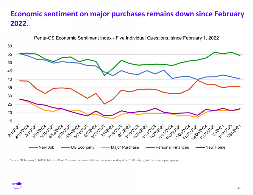 3737.自2022年2月以来,对大规模采购的经济信心仍然低迷。资料来源:ESI:2023年2月1日出版物标题为“随着消费者支出放缓,经济情绪应运而生”网址:https://esi-civicscience.pentagroup.co