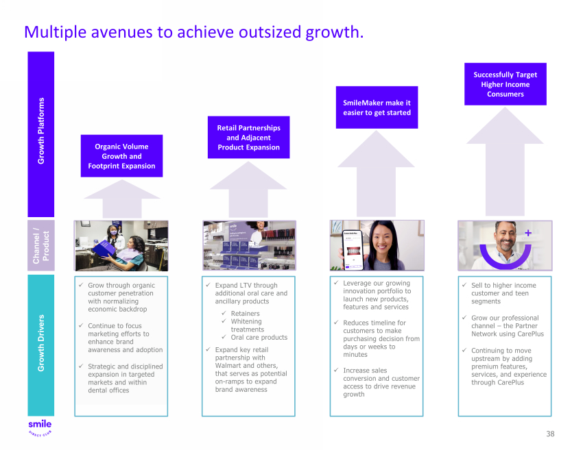 38Gr o w th P lat f orms C h a n n el/P rod u ct Gr o w th D r i v ers有机销量增长和足迹扩张x在经济正常化的背景下通过有机客户渗透实现增长x继续集中营销努力,以提高品牌知名度和采用率x在目标市场和牙科诊所内进行战略性和有纪律的扩张零售合作伙伴关系和相邻产品扩张x通过额外的口腔护理扩大LTV和配套产品x保持剂x美白疗法x口腔护理产品x扩大与沃尔玛和其他公司的关键零售合作伙伴关系,这是扩大品牌知名度的潜力,SmileMaker使入门更容易x利用我们不断增长的创新产品组合推出新产品,功能和服务x将客户做出购买决定的时间从几天或几周缩短到几分钟x增加销售转化和客户准入以推动收入增长成功瞄准高收入消费者x向高收入客户和青少年群体销售x发展我们的专业渠道——使用CarePlus的合作伙伴网络x通过CarePlus增加高端功能、服务和体验,继续向上游移动通过多种途径实现超大规模增长。