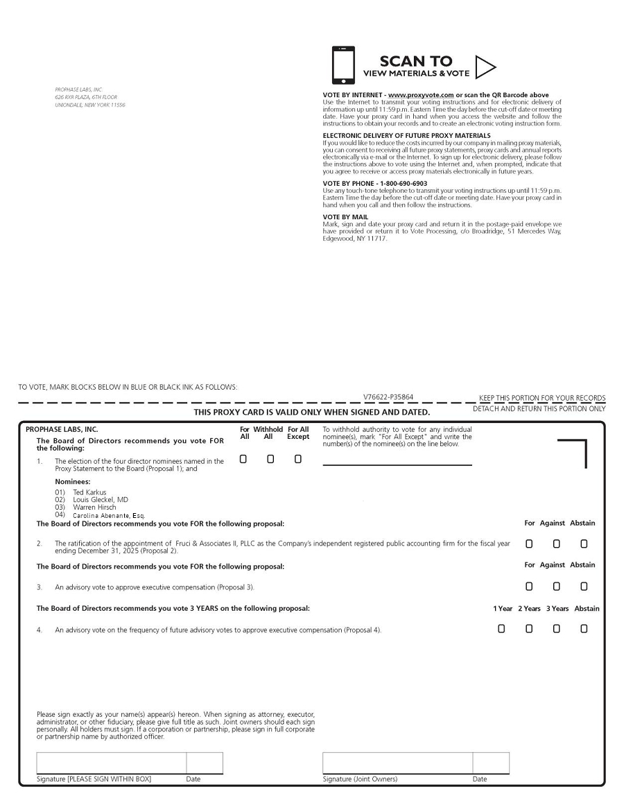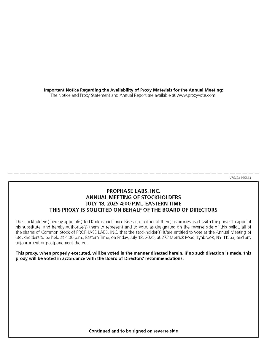 特此通知,特拉华州公司ProPhase实验室,Inc.(“公司”)2025年年度股东大会(“年度会议”)将于美国东部时间2025年7月18日(星期五)下午4:00在纽约州林布鲁克梅里克路273号(Lynbrook,NY 11563)举行,会议目的如下:
