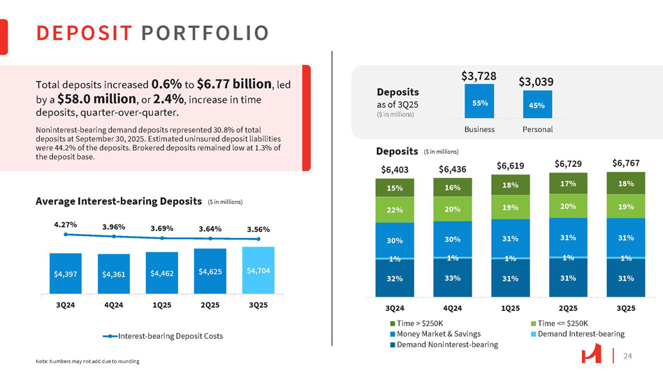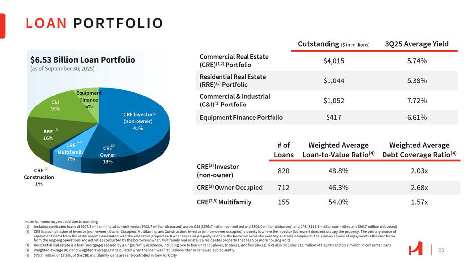 CRE Multifamily 7% 16% C & I 16% Equipment Finance 6% CRE(2)Construction 1%(2,5)CRE(2)Owner 13% CRE Investor(2)(Non-owner)41% RRE(3)65.3亿美元贷款组合(截至2025年9月30日)贷款组合23注:由于四舍五入,数字可能不会相加(1)包括C & I(3.957亿美元承诺和3.090亿美元已支付)和CRE(1.116亿美元承诺和9370万美元已支付)的总承诺(4.027亿美元已支付)中的5.073亿美元银团贷款(2)CRE是投资者(非所有者)、所有者占用、多户家庭和建筑的组合。投资人(或非业主占用)财产是指投资人(借款人)不占用该财产的地方。主要还款来源来自与相关物业相关的租金收入。自住物业是指借款人拥有物业并同时占用物业的地方。还款的主要来源是来自借款人/所有者进行的持续运营和活动的现金流。多户房产是指拥有5个或更多住房单元的住宅物业。(三)住宅不动产是以单户住宅为抵押的贷款(抵押),包括一至四套(复式、三联式、四联式)。RRE还包括110万美元的HELOC和670万美元的消费者贷款(4)加权平均DCR和加权平均LTV,计算时首次承销或随后续贷贷款(5)7870万美元,或17.9%,CRE多户贷款中有租金控制的纽约市Q3未偿平均收益率(百万美元)5.74% $ 4,015商业房地产(CRE)(1,2)投资组合5.38% $ 1,044住宅房地产(RRE)(3)投资组合7.72% $ 1,052商业和工业(C & I)(1)投资组合6.61% $ 417设备金融投资组合加权平均债务覆盖率(4)加权平均贷款与价值比(4)#贷款2.03x 48.8% 820 CRE(2)投资者(非业主)2.68x 46.3% 712 CRE(2)业主占用1.57x 54.0% 155 CRE(2,5)多户