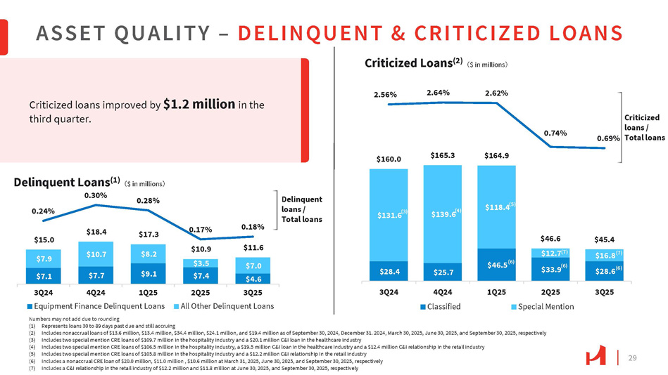 29美元7.7美元9.1美元10.7美元8.2美元15.0美元7.9美元7.1美元18.4美元17.3美元10.9美元3.5美元7.4美元11.6美元7.0美元4.6美元0.24% 0.30% 0.28% 0.17% 0.18% 2Q25 3Q25所有其他拖欠贷款3Q24 4Q24 1Q25设备融资拖欠贷款数量可能不会因资产质量四舍五入而相加– DelinQuent & Criticed Loans拖欠贷款/贷款总额$ 139.6 $ 160.0 $ 165.3 $ 164.9 2.56% 2.64% 2.62% 0.74% Criticed Loans/0.69% Total Loans $ 131.6(3)(1)指逾期30至89天仍应计的贷款(2)包括1360万美元、1340万美元、34.4美元的非应计贷款截至2024年9月30日、12月31日为1940万美元。2024年、2025年3月30日、2025年6月30日和2025年9月30日,分别(3)包括两笔1.097亿美元的酒店行业关注CRE贷款和2010万美元的医疗行业C & I贷款(4)包括两笔1.065亿美元的酒店行业关注CRE贷款,1,950万美元的医疗保健行业C & I贷款和1,240万美元的零售行业C & I关系(5)包括两笔1.058亿美元的酒店行业特别关注CRE贷款和1,220万美元的零售行业C & I关系(6)包括分别在2025年3月31日、2025年6月30日和2025年9月30日的2,000万美元、1,100万美元、1,060万美元的非应计CRE贷款(7)包括在2025年6月30日和2025年9月30日的1,220万美元和1,180万美元的零售行业C & I关系,分别(4)受批评的贷款在第三季度改善了120万美元。拖欠贷款(1)百万美元遭批评贷款(2)百万美元遭批118.4(5)$ 45.4 $ 46.6 $ 16.8(7)$ 28.6(6)$ 12.7(7)$ 33.9(6)$ 46.5(6)$ 25.7 $ 28.4 3Q25 2Q25特别提及1Q25 4Q24分类3Q24