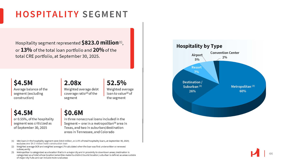 44招待费部门(1)截至9月30日,招待费部门SBA贷款为1900万美元,占招待费贷款总额的2.3%,2025年;不包括一笔400万美元的酒店建设贷款(2)加权平均DCR和加权平均LTV在首次承保或随后续贷时计算(3)Metropolitan被归类为位于主要城市且靠近市中心地区的地点;目的地被归类为酒店,其位置/便利设施使其成为一个独特的旅游地点;郊区被定义为主要城市枢纽之外的区域,可以包括更多的农村地区,截至9月30日,酒店业务代表8.23亿美元(1),占总贷款组合的13%,占CRE组合总额的20%,2025.450万美元部门平均余额(不包括建筑)2.08x部门加权平均债务覆盖率(2)52.5%部门加权平均贷款价值比(2)450万美元或0.55%,截至2025年9月30日,酒店部门在该部门包括的三笔非应计贷款中被批评60万美元——一笔在德克萨斯州的大都市(3)地区,两笔在田纳西州的郊区/目的地地区,以及科罗拉多大都会(3)60%目的地/郊区(3)26%机场5%度假村7%会议中心2%酒店业依类型