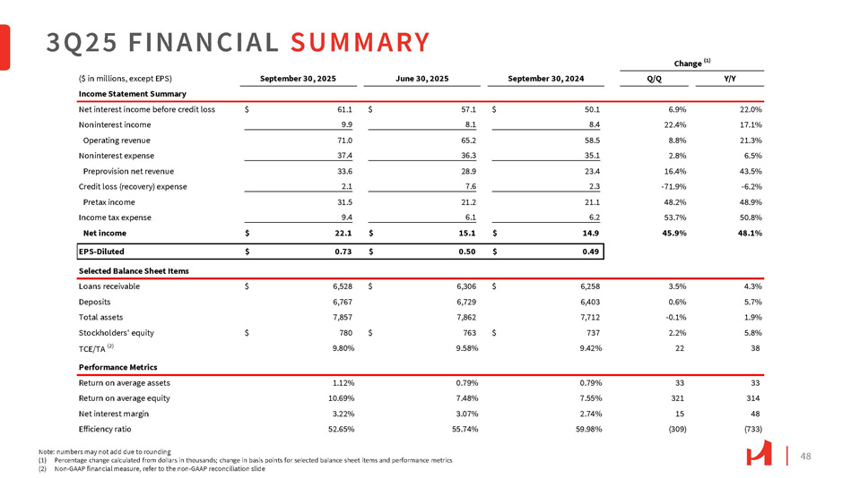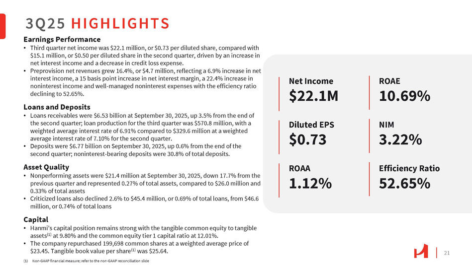 21财报表现•第三季度净收入为2210万美元,合稀释后每股收益0.73美元,而第二季度为1510万美元,合稀释后每股收益0.50美元,这主要得益于净利息收入的增加和信贷损失费用的减少。•拨备前净收入增长16.4%,即470万美元,反映出净利息收入增长6.9%,净息差提高15个基点,非利息收入增长22.4%,以及管理良好的非利息支出,效率比下降至52.65%。贷款及存款•应收贷款于2025年9月30日为65.3亿美元,较第二季度末增长3.5%;第三季度的贷款生产为5.708亿美元,加权平均利率为6.91%,而第二季度的加权平均利率为7.10%,为3.296亿美元。•存款于2025年9月30日为67.7亿美元,较第二季度末增长0.6%;非有息存款占存款总额的30.8%。资产质量•不良资产为21美元。2025年9月30日400万,下降17。较上季度增长7%,占比0。占总资产的27%,相比之下为26美元。0万0。总资产33% •受批评贷款也下降2。6%,报45美元。400万,也就是0。占贷款总额的69%,46美元起。600万,也就是0。贷款总额的74% Capital • Hanmi的资本状况保持强劲,有形普通股对有形资产(1)的比率为9.80%,普通股一级资本比率为12.01%。•该公司以23.45美元的加权平均价格回购了199,698股普通股。每股有形账面价值(1)为25.64美元。(1)Non-GAAP财务指标;参考Non-GAAP调节幻灯片净收入2210万美元稀释EPS 0.73美元ROAA 1.12% ROAE10.69 % NIM3.22 %效率比52.65% 3Q25亮点
