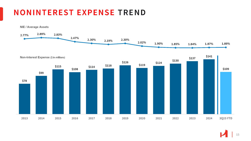 非利息收入趋势14 NII/平均资产71% 92% 82% 82% 74% 80% 81% 88% 57% 72% 83% 76% 72% 29% 8% 18% 18% 26% 20% 19% 12% 43% 28% 17% 19% 23% 5% $ 28 $ 42非利息收入(百万美元)$ 48 $ 33 $ 33 $ 25 $ 28 $ 43 $ 40 $ 34 $ 32 $ 265% 0.99% 1.24% 1.17% 0.76% 0.67% 0.46% 0.50% 0.73% 0.62% 0.49% 0.42% 0.45% 20132014201520162017服务费、费用及其他2021202220232024 3Q25年初至今出售抵押贷款收益201820192020出售SBA贷款收益