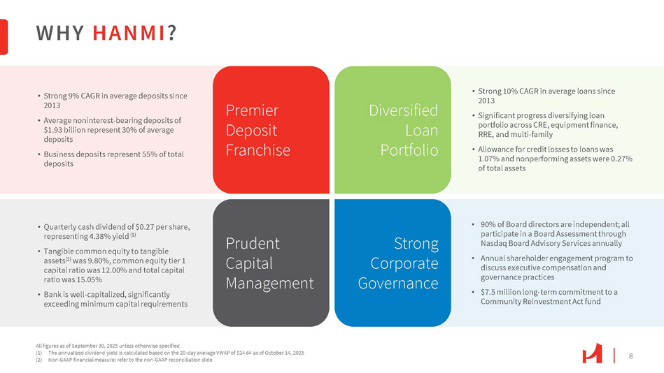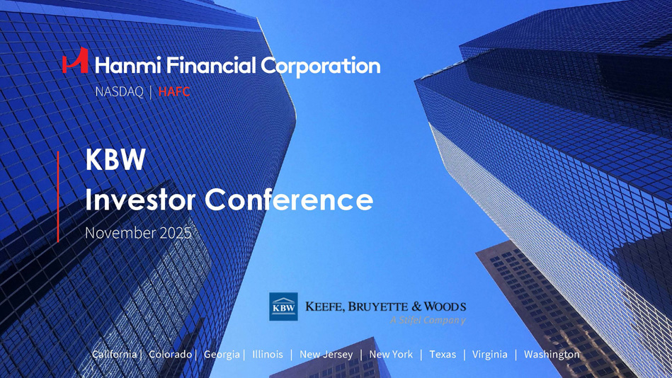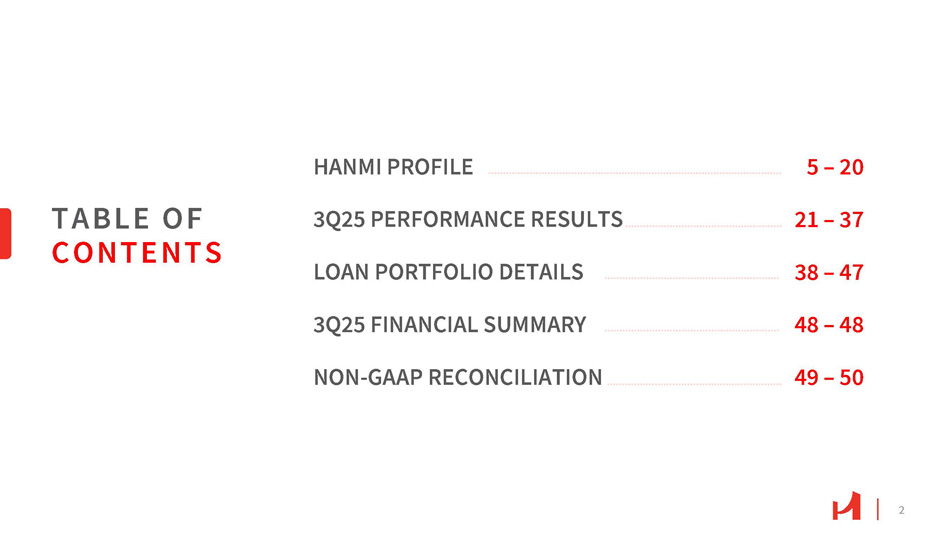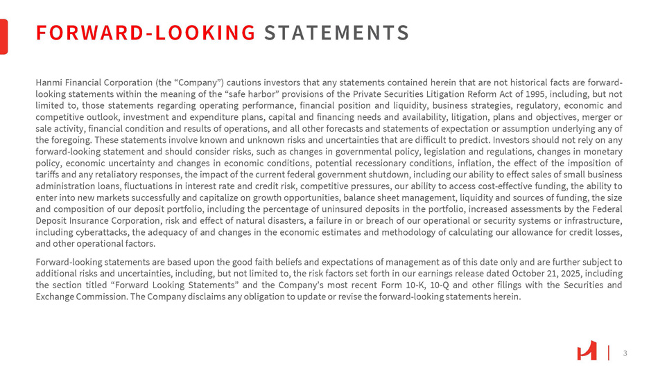 3前瞻性-前瞻性陈述Hanmi Financial Corporation(“公司”)提醒投资者,此处包含的任何非历史事实的陈述均为1995年《私人证券诉讼改革法案》“安全港”条款含义内的前瞻性陈述,包括但不限于有关经营业绩、财务状况和流动性、业务战略、监管、经济和竞争前景、投资和支出计划、资本和融资需求和可用性、诉讼、计划和目标、合并或出售活动、财务状况和经营业绩的陈述,以及基于上述任何内容的所有其他预测和预期或假设陈述。这些陈述涉及已知和未知的风险和不确定性,难以预测。投资者不应依赖任何前瞻性陈述,而应考虑风险,例如政府政策、立法和法规的变化、货币政策的变化、经济不确定性和经济状况的变化、潜在的衰退状况、通货膨胀、征收关税的影响和任何报复性反应、当前联邦政府关闭的影响,包括我们实现小企业管理贷款销售的能力、利率和信贷风险的波动、竞争压力、我们获得具有成本效益的资金的能力、成功进入新市场和利用增长机会的能力,资产负债表管理、流动性和资金来源、我们存款组合的规模和构成,包括组合中未投保存款的百分比、联邦存款保险公司增加的评估、自然灾害的风险和影响、我们的运营或安全系统或基础设施出现故障或遭到破坏,包括网络攻击、经济估计和计算我们的信贷损失准备金的方法的充分性和变化,以及其他运营因素。前瞻性陈述仅基于截至该日期管理层的善意信念和预期,并进一步受到额外风险和不确定性的影响,包括但不限于我们日期为2025年10月21日的收益发布中列出的风险因素,包括标题为“前瞻性陈述”的部分以及公司最近提交给美国证券交易委员会的10-K、10-Q表格和其他文件。公司不承担更新或修改此处前瞻性陈述的任何义务。