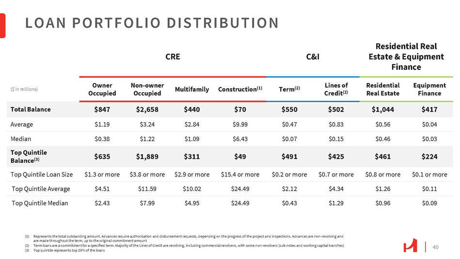 40贷款组合分配住宅房地产和设备融资C & I CRE设备融资住宅房地产信贷额度(2)期限(2)建筑(1)多户非自住业主占用(百万美元)$ 417 $ 1,044 $ 502 $ 550 $ 70 $ 440 $ 2,658 $ 847总余额$ 0.04 $ 0.56 $ 0.83 $ 0.47 $ 9.99 $ 2.84 $ 3.24 $ 1.19平均$ 0.03 $ 0.46 $ 0.15 $ 0.07 $ 6.43 $ 1.09 $ 1.22 $ 0.38中位数$ 224 $ 461 $ 425 $ 491 $ 49 $ 311 $ 1,889 $ 635 Top Quintile Balance(3)$ 0.1 or more $ 0.8 or more $ 0.7 or more $ 0.2 or more $ 15.4 or more $ 2.9 or more $ 3.8 or more或更多Top Quintile Loan Size $ 0.11 $ 1.26 $ 4.34 $ 2.12 $ 24.49 $ 10.02 $ 11.59 $ 4.51 Top Quintile Average $ 0.09 $ 0.96 $ 1.29 $ 0.43 $ 24.49 $ 4.95 $ 7.99 $ 2.43 Top Quintile Median(1)表示未偿还总额。垫款需要授权和支付请求,具体取决于项目进展和检查情况。垫款不循环,在整个期限内进行,最高不超过原承诺金额(2)定期贷款为特定期限的承诺。大部分信贷额度是循环的,包括商业循环,还有一些非循环(次级票据和营运资金部分)(3)前五分之一代表贷款的前20%