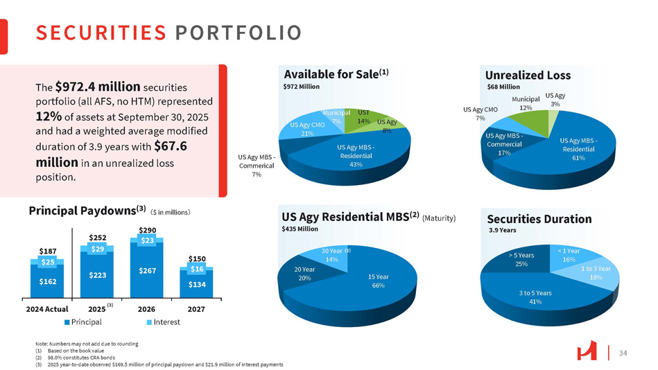 3415年66% 20年20%证券投资组合$ 162 $ 223 $ 267 $ 134 $ 25 $ 29 $ 23 $ 16 $ 187 $ 252 $ 290 $ 1502024实际20272026年利息3% US AGY MBS-住宅61% US AGY MBS-商业17% US AGY CMO 7%市政12% US AGY 8% US AGY MBS-住宅43% US AGY MBS-商业7% US AGY CMO 21%市政UST 7% 14%可用待售(1)9.72亿美元< 1年16% 1至3年18% 3至5年41% > 5年25%未实现亏损6800万美元美国AGY证券存续期3.9年4.35亿美元30年(2)14% 2025(3)本金说明:由于四舍五入,数字可能不会相加(1)基于账面价值(2)98.0%构成CRA债券(3)2025年迄今观察到1.695亿美元的本金偿还和2190万美元的利息支付9.724亿美元的证券投资组合(均为AFS,无HTM)占9月30日资产的12%,2025年,加权平均修正存续期为3.9年,未实现亏损6760万美元。本金偿还(3)百万美元丨美国Agy住宅MBS(2)(到期)
