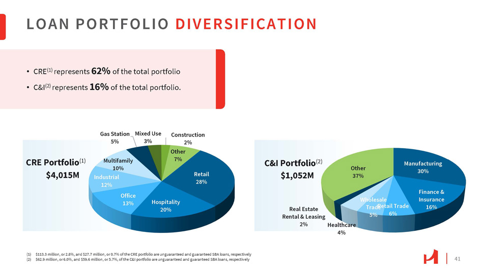 贷款组合多样化(1)1.133亿美元,或2.8%,CRE组合中的2770万美元,或0.7%分别为无担保和有担保SBA贷款,(2)6290万美元,或6.0%,C & I组合中的5960万美元,或5.7%为无担保和有担保SBA贷款,分别为零售28%酒店20%办公13%工业12%多户家庭10%加油站5%混合用途3%建筑2%其他7% CRE投资组合(1)40.15亿美元制造业30%金融和保险16% 6%批发贸易5%医疗保健4%房地产租赁和租赁2%其他37% C & I投资组合(2)10.52亿美元• CRE(1)占总投资组合的62% • C & I(2)占总投资组合的16%。41