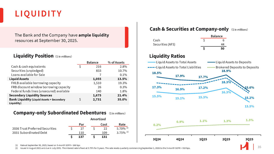 2025年9月30日的35流动性3Q24 4Q24(1)利率,基于2021年8月发行、2031年7月到期的3个月SOFR + 166bps(2)。利率固定为3.75%,5年期。利率从2026年9月1日开始按季度重置为3个月SOFR + 310个基点。15.5% 15.1% 15.3% 16.3% 13.5% 18.5% 17.9% 17.7%流动资产转存款经纪存款转存款18.9% 15.6% 17.3% 16.9% 17.2% 18.3% 15.2% 0.2% 0.9% 1.1% 1.3% 1Q25 2Q25 3Q25流动资产转总资产流动资产转总负债流动性头寸百万美元公司现金和证券-仅百万美元公司-仅次级债券百万美元流动性比率资产余额2.8% 216美元现金和现金等价物10.7% 833证券(未质押)0.1% 7可贷待售13.5% 1,055流动资产19.3% 1,510 FHLB可用借款能力0.3% 26 FRB贴现窗口借款能力1.8% 140联邦基金额度(无担保)可用21.4% 1,675二级流动性来源35.0% 2,731美元银行流动性(流动资产+二级流动性)余额6美元现金44证券(AFS)50美元摊销率成本PAR5.70 % 22美元27美元2036美元信托优先证券3.75% 1091102031次级债131美元137美元截至2025年9月30日,银行和公司流动性资源充裕。(1) (2)