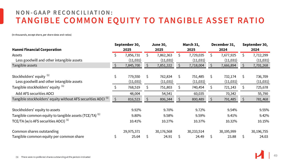49 NON-G A A P R E C O N C I L I A T I O N:有形普通股本与有形资产比率(1)于所示期间9月30日、12月31日、3月31日、6月30日、9月30日没有发行在外的优先股,20242024202520252025 Hanmi Financial Corporation 7,712,299美元7,677,925美元7,729,035美元7,862,363美元7,856,731美元资产(11,031)(11,031)(11,031)(11,031)(11,031)减去商誉和其他无形资产7,701,268美元7,666,894美元7,718,004美元7,851,332美元7,845,700美元有形资产736,709美元732,174美元751,485美元762,834美元779,550美元股东权益(1)(11,031)(11,031)(11,031)(11,031)减去商誉和其他无形资产725,678美元721,143美元740,454美元751,803美元768,519美元(1)有形股东权益55,79070,34260,03554,54148,004加AFS证券AOCI 781,468美元791,485美元800,489美元806,344美元816,523有形股东权益不含AFS证券AOCI(1)9.55% 9.54% 9.72% 9.70% 9.92%股东权益比资产9.42% 9.41% 9.59% 9.58% 9.80%有形普通股权益比有形资产(TCE/TA)(1)10.15% 10.32% 10.37% 10.27% 10.41% TCE/TA(不含AFS证券AOCI)(1)30,196,75530,195,99930,233,51430,176,56829,975,371已发行普通股24.03美元23.88美元24.49美元24.91美元25.64美元每股有形普通股权益(以千为单位,每股数据和比率除外)
