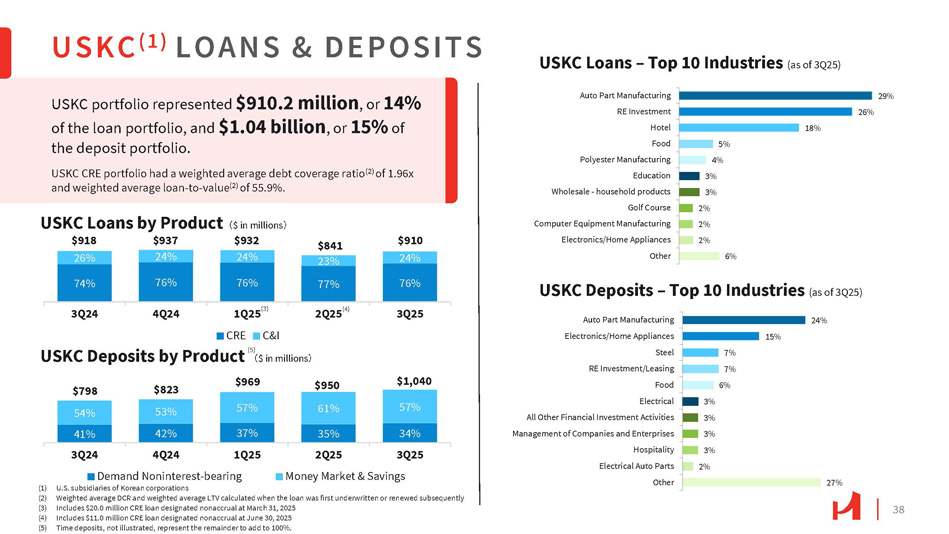 USKC(1)贷款和存款USKC投资组合为9.102亿美元,占贷款组合的14%,以及10.4亿美元,占存款组合的15%。USKC CRE投资组合的加权平均债务覆盖率(2)为1.96x,加权平均贷款与价值(2)为55.9%。USKC贷款– 10大行业(截至3Q25)29% 26% 18% 5% 4% 3% 3% 2% 2% 2% 6%汽车零部件制造再投资酒店食品聚酯制造教育批发-家居产品高尔夫球场计算机设备制造电子/家电其他24%汽车零部件制造15%电子/家电7%钢铁7%再投资/租赁6%食品3%电气3%所有其他金融投资活动3%公司管理和企业3%招待费2%电气汽车零部件27%其他38个USKC存款– 10大行业(截至2015年第三季度)91826% 74% 93724% 76% 93224% 76% 84123% 77% 91024% 76% 3Q24 4Q24 3Q25 USKC贷款按产品计百万美元1Q25(3)CRE C & I 2Q25(4)USKC存款按产品计百万美元798美元823美元969美元95057% 61% 57% 53% 54% 34% 35% 37% 42% 41% 3Q25 2Q25 1Q25 4Q24 3Q24 1,040美元活期无息货币市场和储蓄(1)韩国公司的美国子公司(2)加权平均DCR首次承销或随后续贷时计算的加权平均LTV(3)包括截至2025年3月31日指定为非应计的2000万美元CRE贷款(4)包括截至2025年6月30日指定为非应计的1100万美元CRE贷款(5)定期存款,未说明,代表剩余部分将增加到100%。(5)