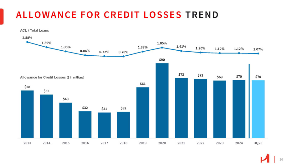 无息支出趋势15 NIE/平均资产无息支出(百万美元)99美元78美元115美元108美元114美元118美元126美元119美元124美元130美元137美元141美元109美元2.77% 2.89% 2.83% 2.47% 2.30% 2.19% 2.30% 2.02% 1.90% 1.85% 1.84% 1.87% 1.89% 201320142015201620172018201920202021202220232024 3Q25 YTD