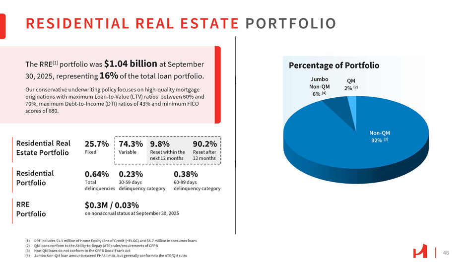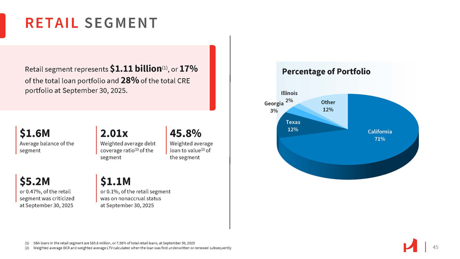 45零售部门零售部门代表11.1亿美元(1),占2025年9月30日总贷款组合的17%和总CRE组合的28%。160万美元部门平均余额2.01x部门加权平均债务覆盖率(2)45.8%部门加权平均贷款与价值(2)520万美元或0.47%,零售部门在2025年9月30日受到批评110万美元或0.1%,零售部门在2025年9月30日处于非应计状态加利福尼亚州71%得克萨斯州12%伊利诺伊州佐治亚州2% 3%其他12%投资组合百分比(1)零售部门的SBA贷款为8380万美元,或零售贷款总额的7.58%,2025(二)首次承销或后续续贷时计算的加权平均DCR和加权平均LTV