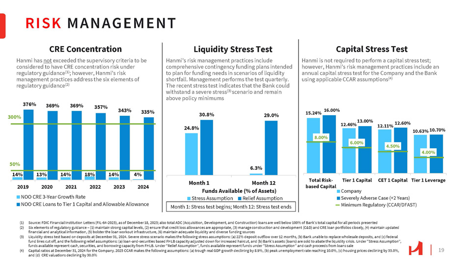 风险管理19 CRE集中度韩美未超过监管标准被视为存在监管指导下的CRE集中度风险(1);然而,韩美的风险管理实践涉及监管指导的六个要素(2)14% 13% 14% 18% 14% 4% 376% 369% 369% 357% 343% 335% 300% 50% 201920202021202220232024 NOO CRE 3年增长率NOO CRE贷款至一级资本和允许津贴(1)资料来源:FDIC Financial Institution Letters(FIL-64-2023),截至2023年12月18日;还有总ADC(收购、开发、(2)监管指引的六个要素–(1)保持强劲的资本水平,(2)确保信贷损失准备适当,(3)密切管理建设开发(C & D)和CRE贷款组合,(4)保持最新的财务和分析信息,(5)支持贷款锻炼基础设施,(6)保持充足的流动性和多样化的资金来源(3)基于2024年12月31日存款的流动性压力测试。严重压力情景做出以下压力假设:(a)12个月内22%的存款外流,(b)银行无法取代批发存款,(c)联邦基金额度被切断,以及以下救济假设:(a)基于贷款和证券的FHLB能力因削减增加而下调,以及(b)银行的资产(贷款)被出售以缓解流动性危机。在“压力假设”下,可用资金代表现金、证券和从FHLB借款的能力。在“缓解假设”下,可用资金为公司2024年12月31日“压力假设”下的资金和出售贷款的现金收益(4)资本比率。2025年CCAR做出以下假设:(a)谷底实际GDP增长下降8.9%,(b)失业率峰值达到10.0%,(c)房价下降33.0%,(d)CRE估值下降30.0%流动性压力测试Hanmi的风险管理实践包括旨在规划流动性短缺情景下的资金需求的综合应急资金计划。管理层每季度进行一次测试。最近的压力测试表明,银行可以承受严重的压力(3)情景,并保持在政策最低24.8% 6.3% 30.8% 29.0%月1个月12可动用资金(占资产百分比)压力假设缓解假设资本压力测试韩米不需要进行资本压力测试;然而,韩美的风险管理实践包括使用适用的CCAR假设(4)对公司和银行进行年度资本压力测试(4)15.24% 12.46% 13.00% 12.11% 12.60% 10.63% 10.70% 16.00% 8.00% 6.00% 4.50% 4.00%总风险型资本一级资本公司CET 1资本一级杠杆严重不良情况(+ 2年)最低监管(CCAR/DFAST)第1月:压力测试开始;第12个月:压力测试结束