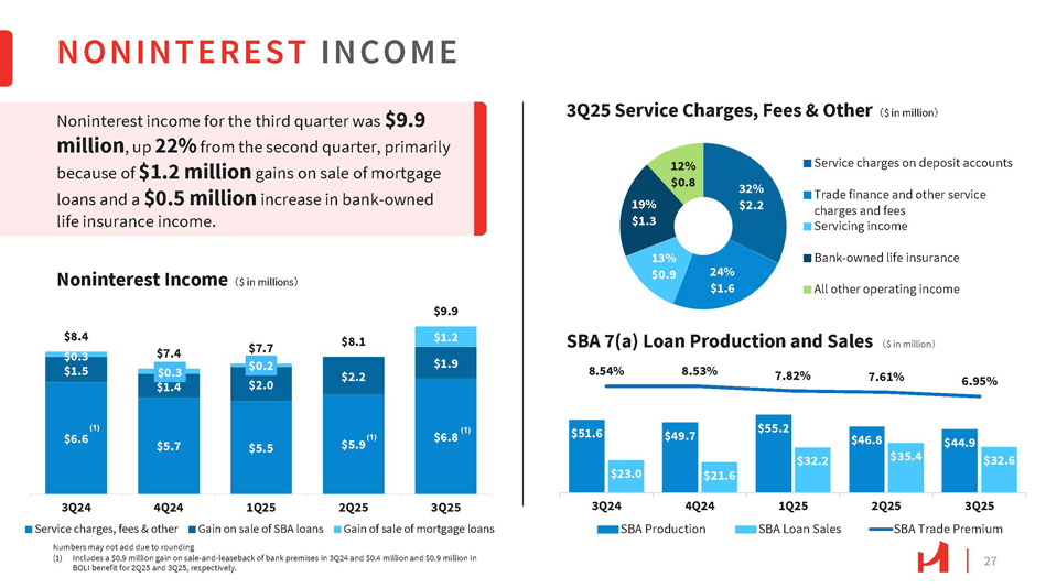 2732% $ 2.224% $ 1.613% $ 0.9 19% $ 1.312% $ 0.8存款账户服务费贸易融资和其他服务费用和服务收入银行拥有的人寿保险所有其他营业收入非利息收入$ 51.6 $ 49.7 $ 55.2 $ 46.8 $ 44.9 $ 23.0 $ 21.6 $ 32.2 $ 35.4 $ 32.68.54% 8.53% 7.82% 7.61% 6.95% 3Q24 4Q24 SBA Production 1Q25 SBA Loan Sales 2Q25 3Q25 SBA Trade Premium $ 5.7 $ 5.5 $ 5.9 $ 1.4 $ 2.0 $ 2.2 $ 0.3 $ 0.2 $ 1.2 $ 1.9 $ 8.4 $ 0.3 $ 1.5 $ 7.4 $ 7.7 $ 8.1 $ 9.9 3Q24 4Q24服务费,费用&其他1Q25 SBA贷款出售收益2Q25 3Q25抵押贷款出售收益(1)由于四舍五入,6.6美元的数字可能不会相加(1)包括3Q24出售和回租银行房地的90万美元收益,以及2Q25和3Q25的BOLI收益分别为40万美元和90万美元。第三季度非利息收入为990万美元,比第二季度增长22%,这主要是因为出售抵押贷款获得了120万美元的收益,以及银行拥有的人寿保险收入增加了50万美元。非利息收入百万美元3Q25服务费、费用及其他百万美元SBA 7(a)贷款生产和销售百万美元(1)$ 6.8(1)