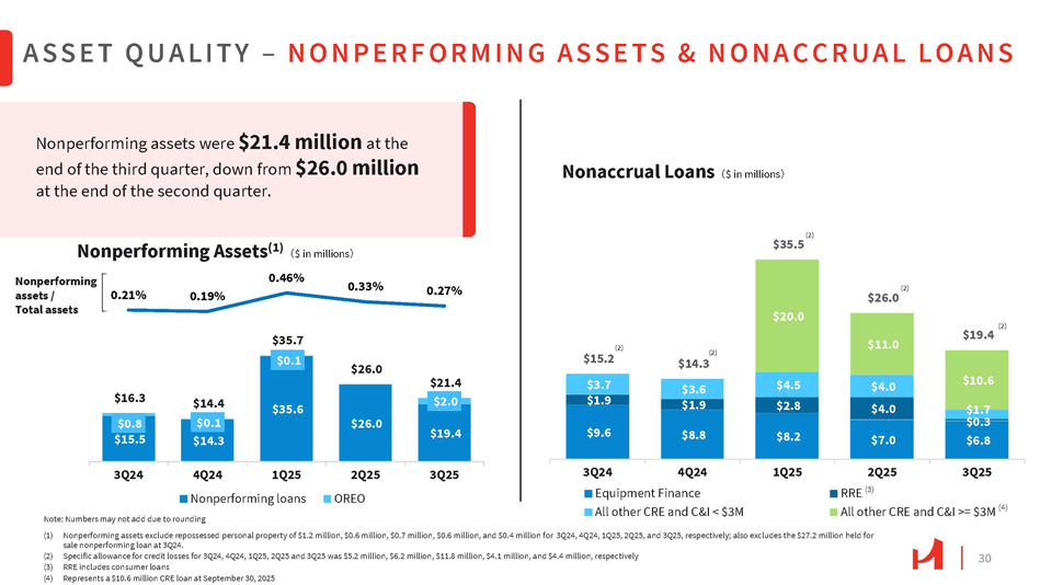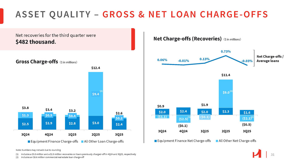 30第三季度末不良资产为2140万美元,低于第二季度末的2600万美元。15.5美元14.3美元35.6美元26.0美元19.4美元0.8美元0.1美元0.1美元2.0美元16.3美元14.4美元35.7美元26.0美元21.4美元0.21% 0.19% 0.46% 0.33% 0.27% 3Q25 2Q25 OREO 3Q24 4Q24 1Q25不良贷款注:由于资产质量四舍五入,数字可能不会相加–不良资产和非不良贷款(1)不良资产不包括在3Q24、4Q24、1Q25、2Q25和3Q25分别为120万美元、60万美元、70万美元、60万美元和40万美元的抵债个人财产;也不包括在3Q24的2720万美元持有待售不良贷款。(2)3Q24、4Q24、1Q25、2Q25和3Q25的特定信贷损失准备金分别为520万美元、620万美元、1180万美元、410万美元和440万美元,(3)RRE包括消费者贷款(4)代表9月30日的1060万美元CRE贷款,2025(2)$ 35.5 1Q25 3Q24 4Q24 Equipment Finance All other CRE and C & I < $ 3M(2)$ 19.4 $ 11.0 $ 20.0(2)$ 14.3(2)$ 15.2 $ 10.6 $ 1.7 $ 0.3 $ 6.8 $ 4.0 $ 7.0 $ 4.5 $ 2.8 $ 8.2 $ 3.6 $ 1.9 $ 8.8 $ 3.7 $ 1.9 $ 9.6(2)$ 26.0 2Q25 3Q25 RRE(3)All other CRE and C & I > = $丨300万3M(4)不良资产(1)$百万非应计贷款$百万不良资产/总资产